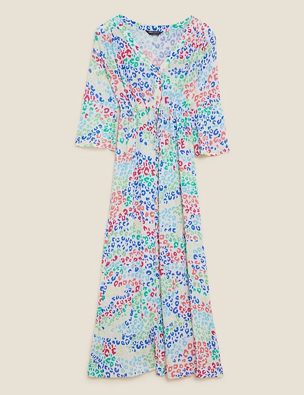 With its eye-catching animal print, this shirred beach cover-up dress will turn heads. It’s cut to a regular fit, with a feminine v-neckline and tie-waist fastening for comfort. The piece has three-quarter-length sleeves and a maxi length with a floaty hem.