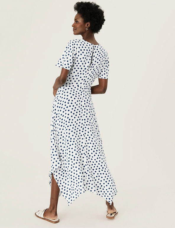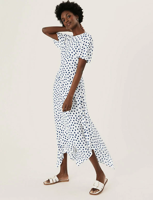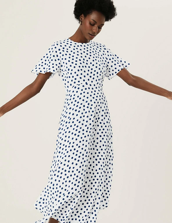 With its playful polka dots and flattering waisted shape, this tea dress is a true day-to-night hero. It’s cut to a regular fit for throw-on-and-go appeal, with casual short sleeves and a round neck. The on-trend midi-length hem has an asymmetric finish for extra movement. This piece closes with a button and zip fastening at the back.