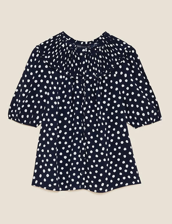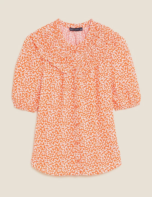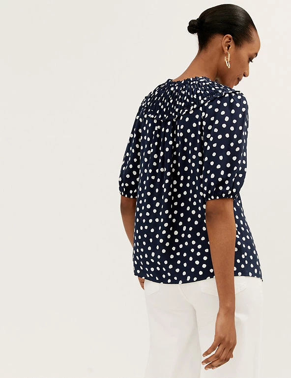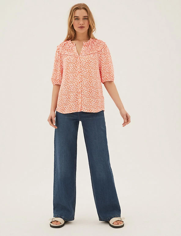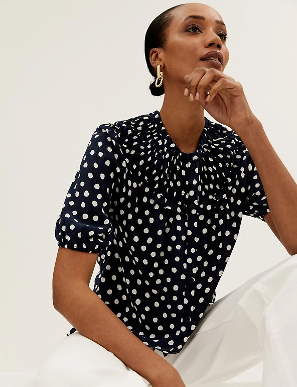A fun print gives this blouse a playful look. Regular fit, with a smocked round neck and gathered short sleeves for a touch of volume. Button-down fastening for a tidy finish. Made with sustainably sourced viscose. M&S Collection: easy-to-wear wardrobe staples that combine classic and contemporary styles.
