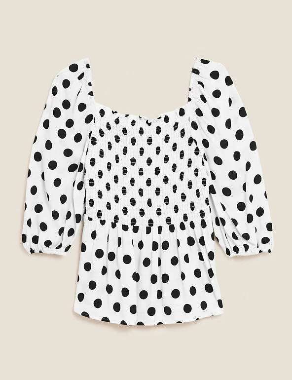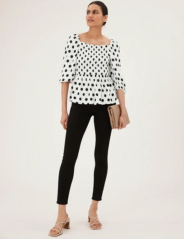 For striking shaping, pull on this polka dot top. It’s cut in a regular fit with a square neck, peplum hem and voluminous 3/4 length sleeves for an eye-catching silhouette. M&S Collection: easy-to-wear wardrobe staples that combine classic and contemporary styles.