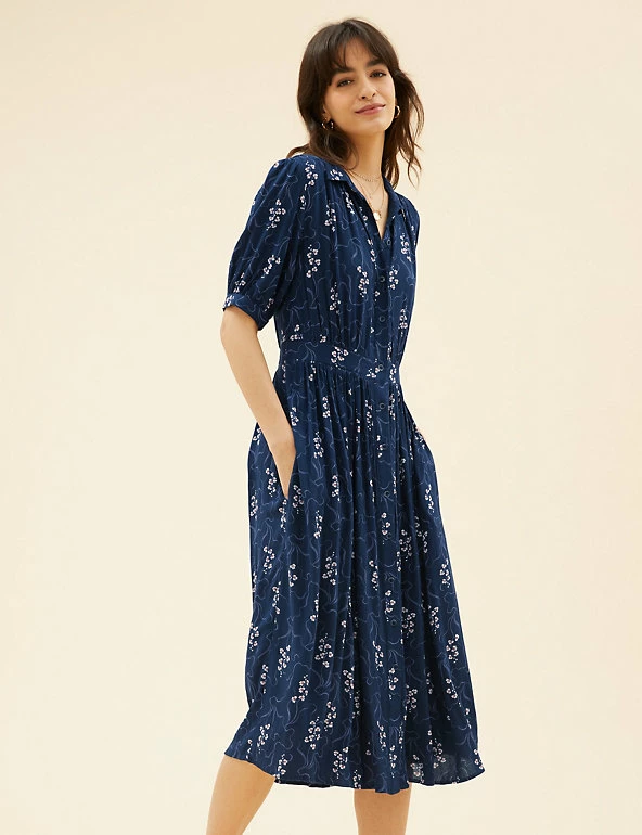 Bring a touch of elegance to your day with this printed shirt dress from our Per Una range. It’s cut to a regular fit, with a flattering waisted silhouette and an easy midi length. Gathers through the top and skirt create movement. Short sleeves, a button-down front and a collar create a tidy finish. Made with sustainably sourced viscose.