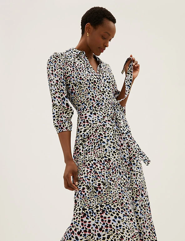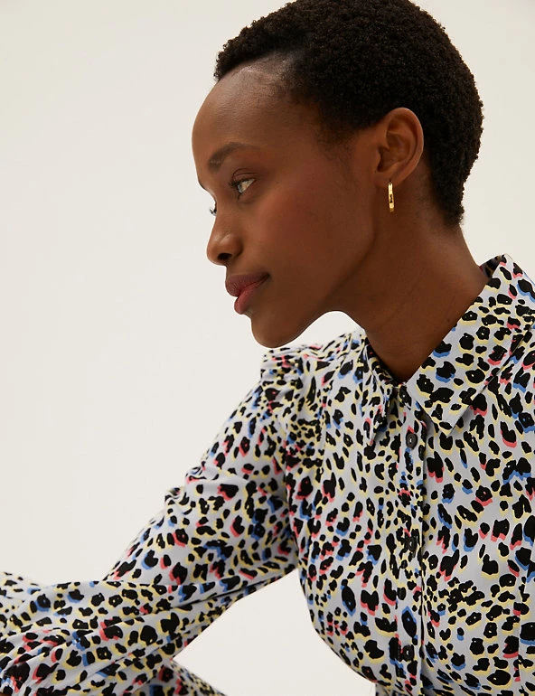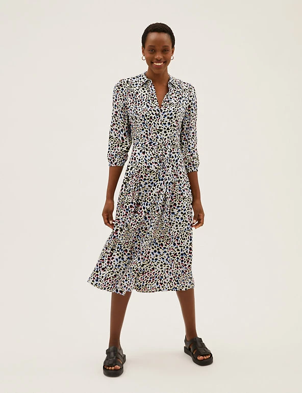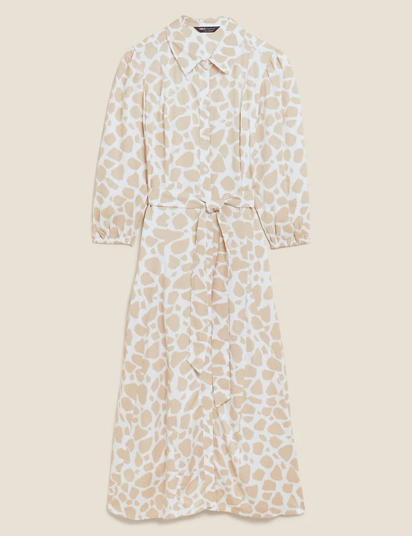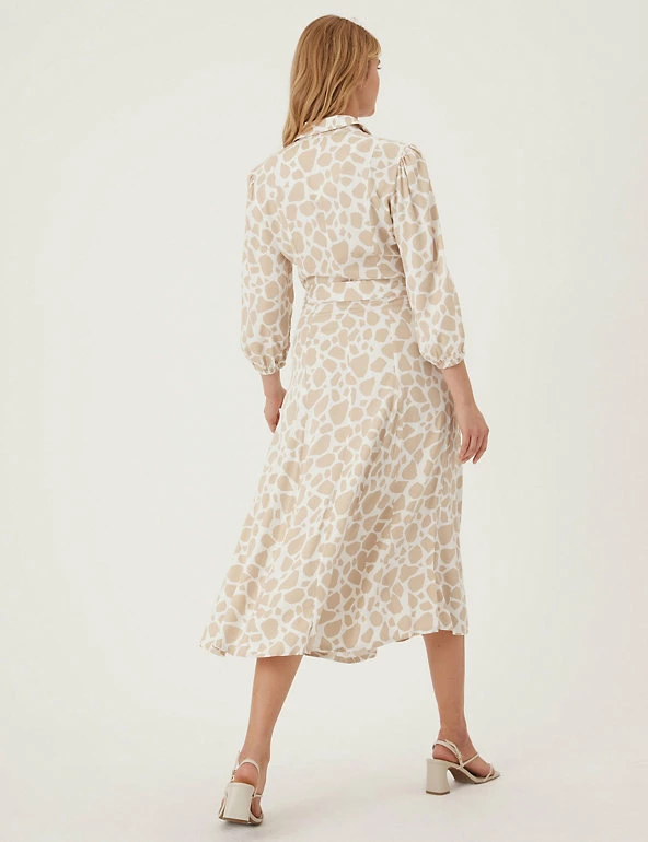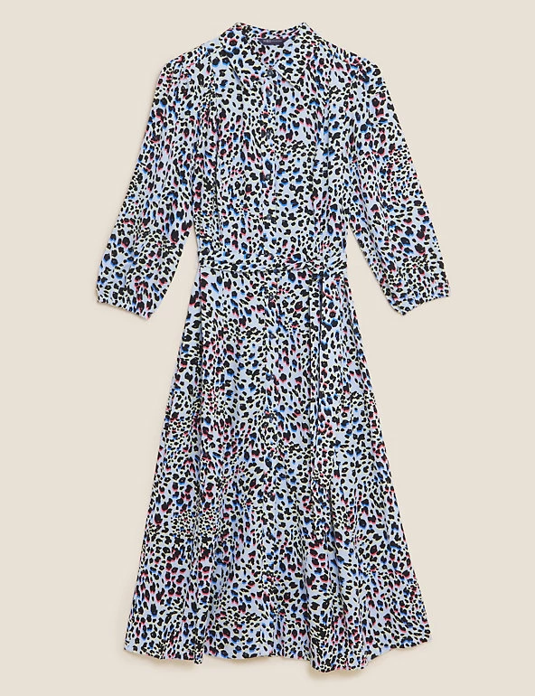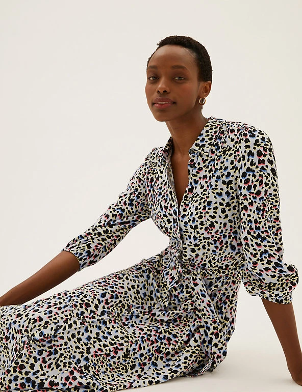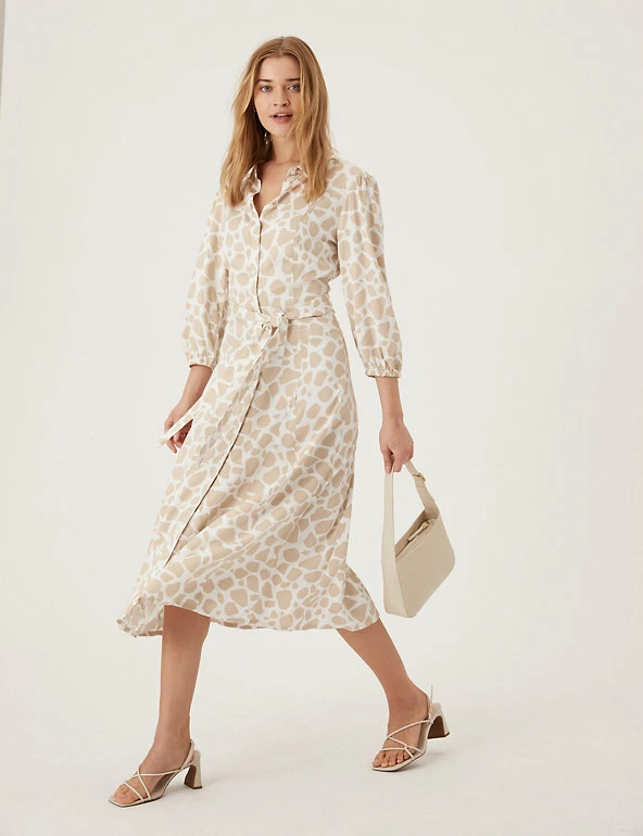 We’ve crafted this animal print shirt dress to turn heads. It’s cut in a regular fit and midi length with a waste-cinching self-tie belt for flattering shaping. The 3/4 length puff sleeves add a voluminous effect, while a button fastening and neat collar offer a tidy finish. Made with sustainably sourced viscose.
