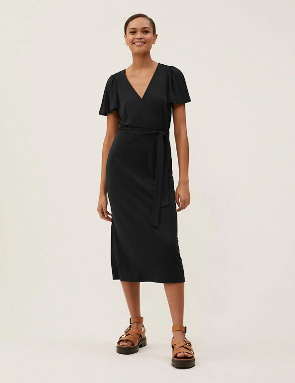 Crafted from easy jersey fabric in a wrap-over style, this classic dress creates a flattering look. It’s cut to a regular fit for all-day comfort and features a tie fastening around the waist for extra shaping. The design sits at an elegant midi length and is finished with short sleeves and a sophisticated v-neck.