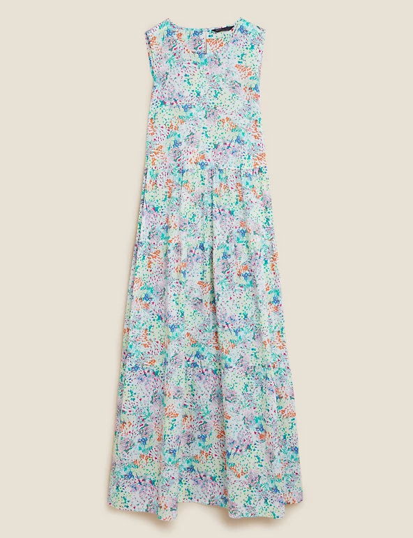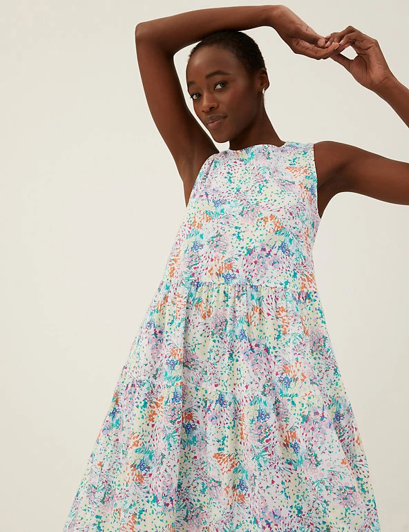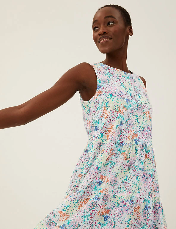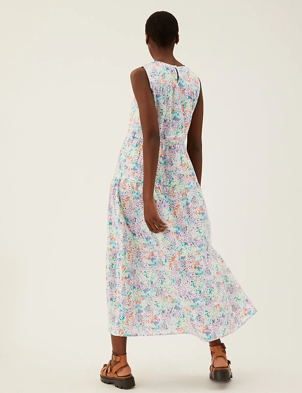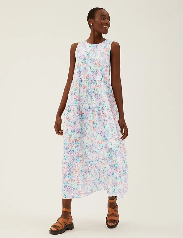 Bring a floral pop to your day with this pure cotton midaxi dress. It’s cut in a relaxed fit with tiers through the skirt for subtle shaping and a sleeveless style for an airy effect. Fasten it with the covered button behind the round neck for a neat finish. We only ever use responsibly sourced cotton for our clothes.