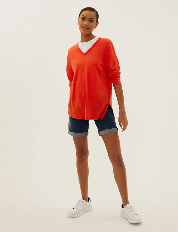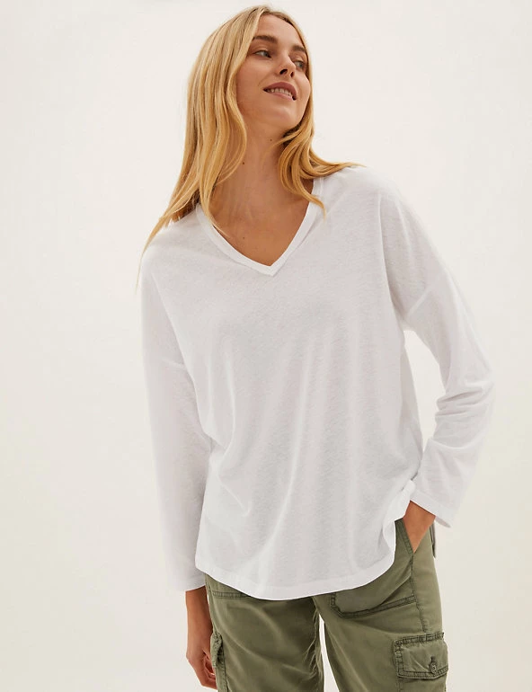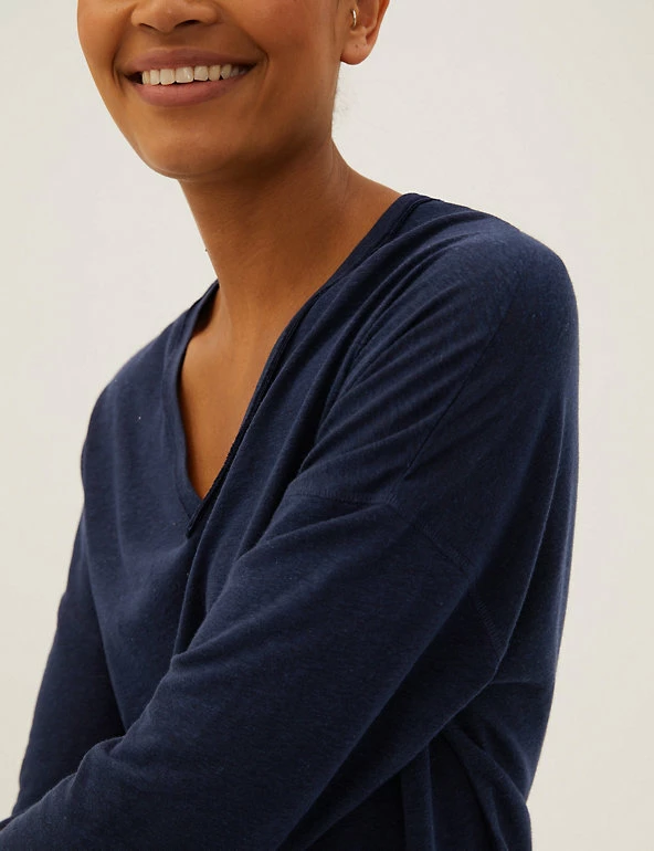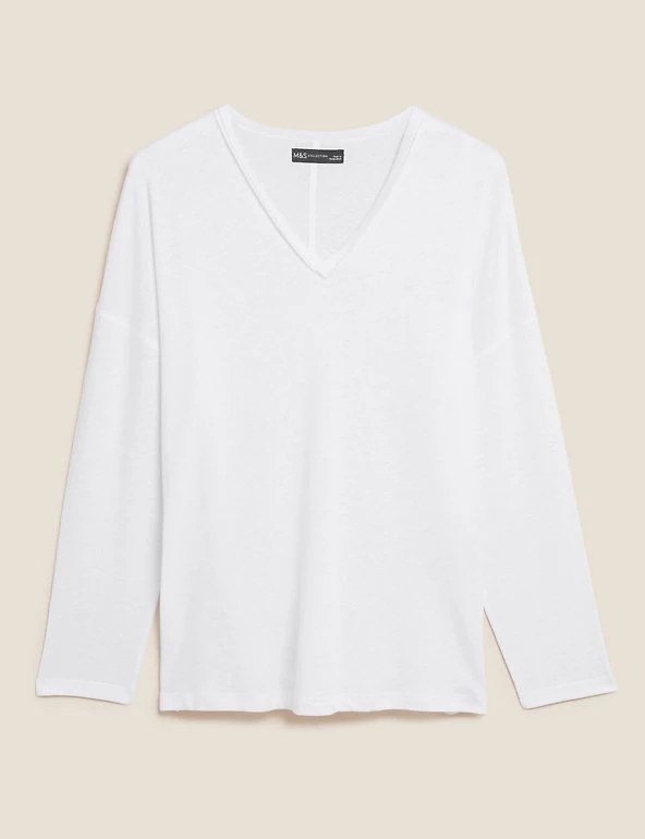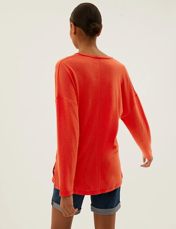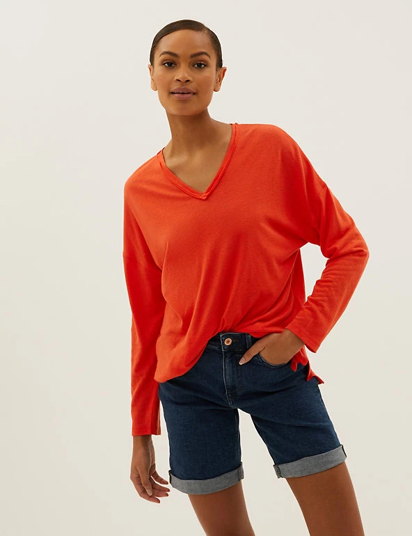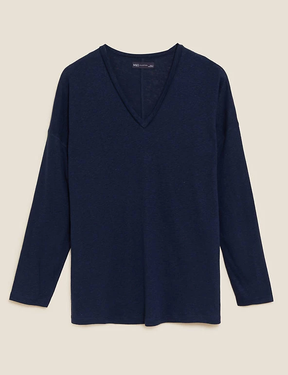 Create a crisp casual look with this linen-rich top. Flattering longline design, cut to an easy relaxed fit with a chic v-neck.