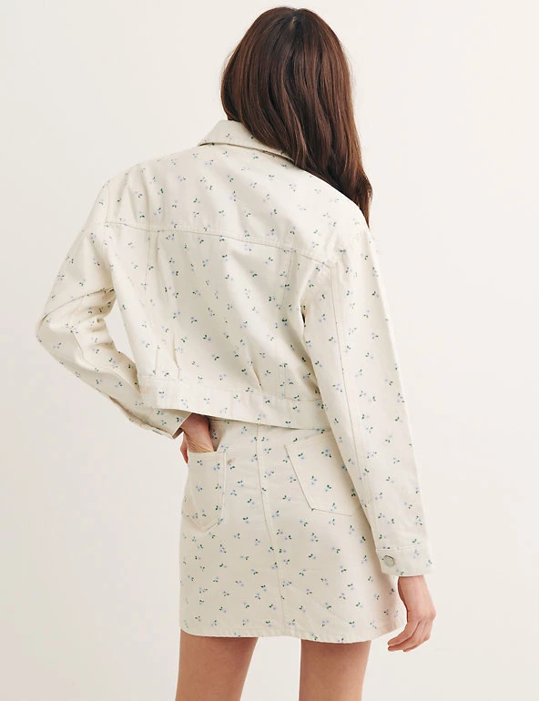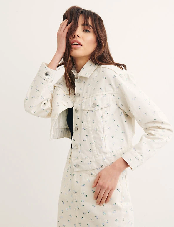 Sunny spring days call for this printed floral denim jacket from Nobody’s Child. It’s designed in a comfy regular fit with a cool cropped length. Chest pockets, buttoned cuffs and button closure add classic styling details. This stylish piece is finished with an embroidered logo on the back hem for a signature touch. Made with organic cotton.