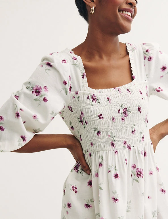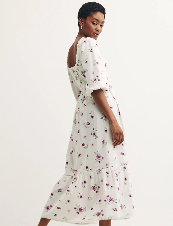 Dial up the romance in your wardrobe with this charming cotton-rich dress by Nobody’s Child. It’s designed with a fitted shirred body and a midi-length skirt with a billowy tiered hem. Voluminous puff sleeves and a square neckline with a frilled trim add to its whimsical aesthetic. A hint of linen in the fabric brings a breezy and breathable feel.