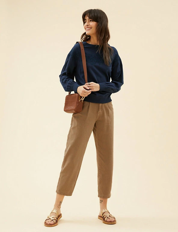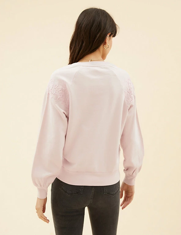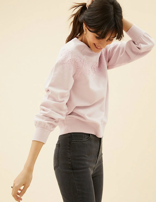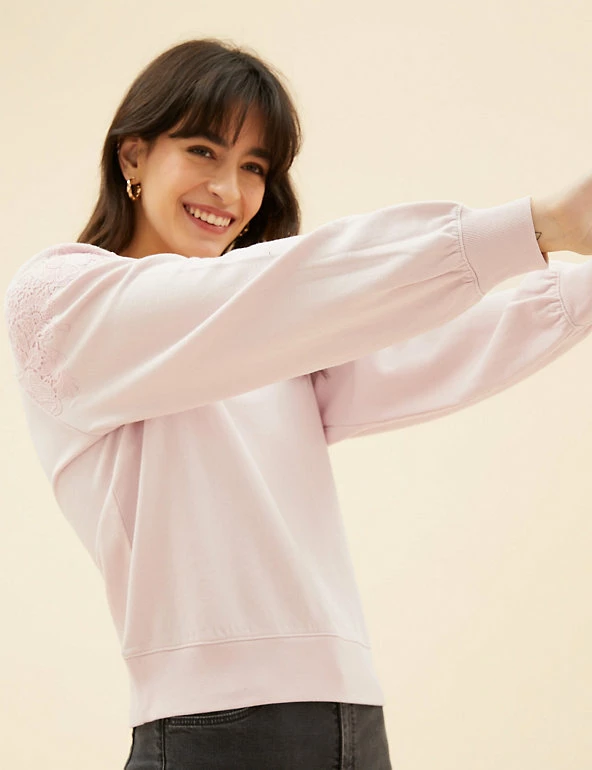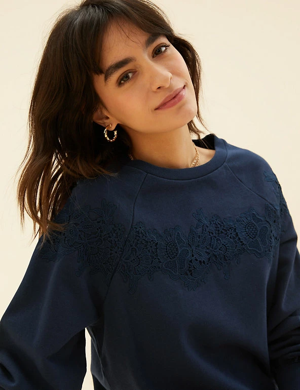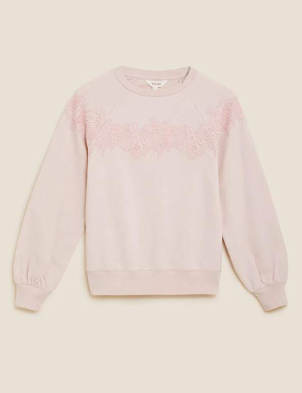 Floral lace detailing gives this pure cotton Per Una sweatshirt a beautifully feminine feel. It’s cut in a regular fit with a simple round neck. The cuffs and hem are ribbed for a snug feel. We only ever use responsibly sourced cotton for our clothes.