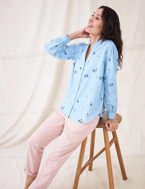 Refresh your weekend look by throwing on this statement pure cotton blouse by White Stuff. This regular-fit piece is adorned with striking contrast embroidery for a playful twist. It features a modern frilled v-neck design and a simple button-through fastening. Long sleeves with buttoned cuffs give it a smart finish.
