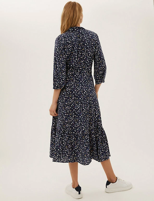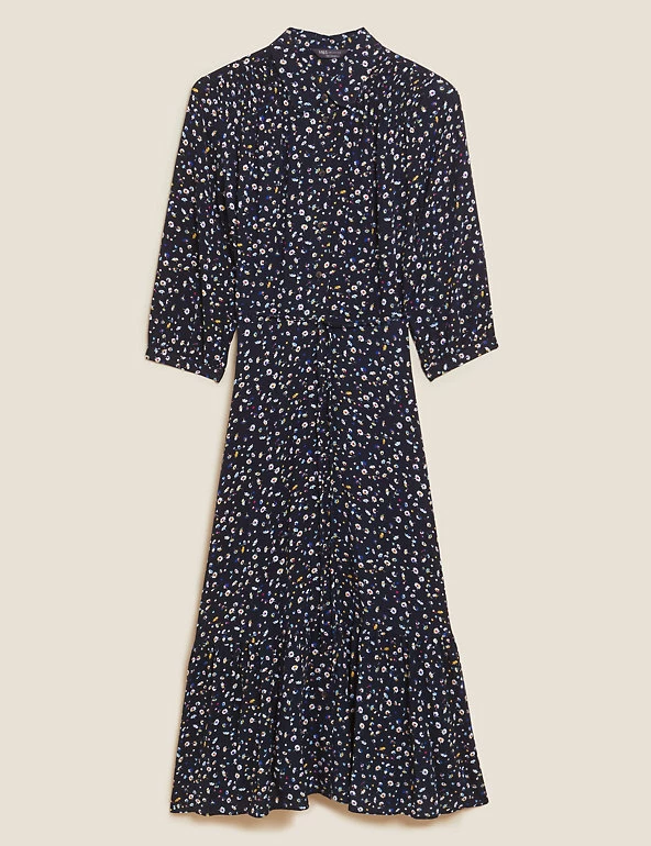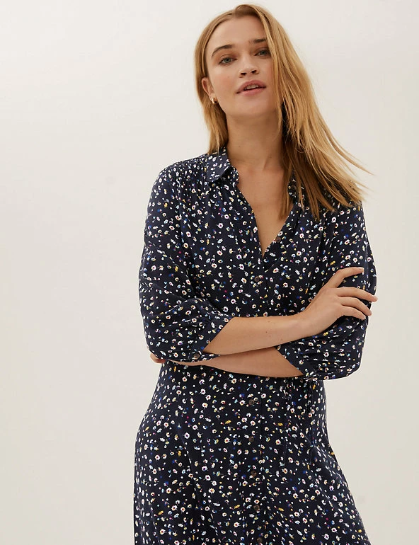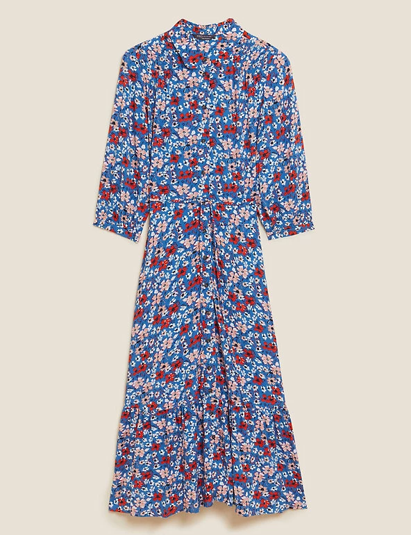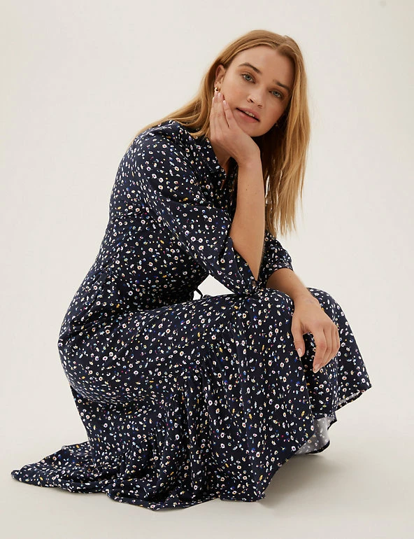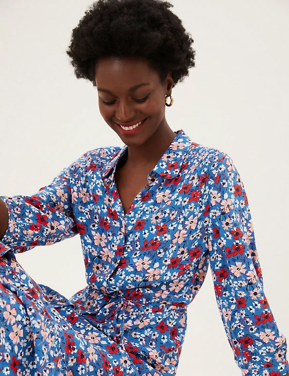 Smart and swishable, this floral midi shirt dress is ready for any occasion. It’s cut in a regular fit and is cinched in at the waist with the belt for flattering shaping. Long sleeves and tiers through the skirt create a striking silhouette. The collar and button-through front offer a neat finish. Made with sustainably sourced viscose.