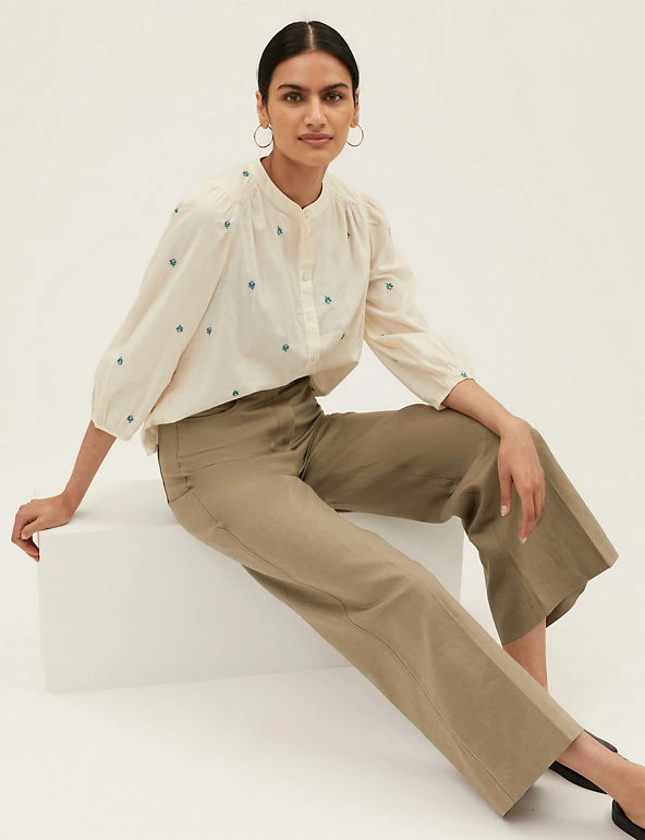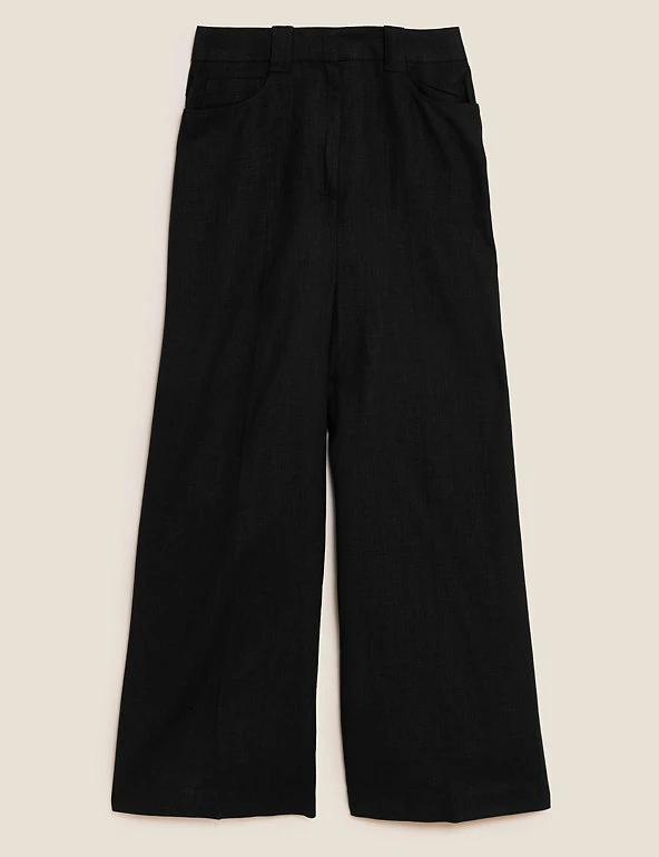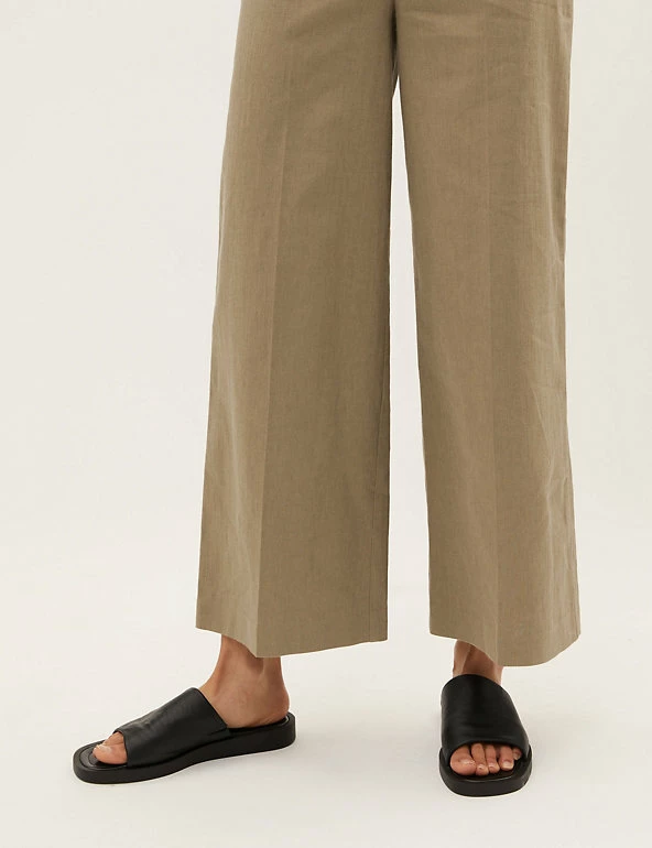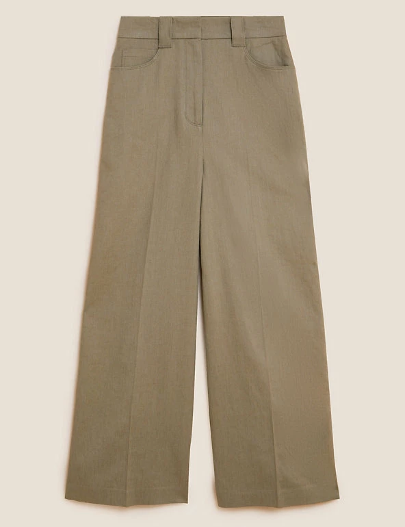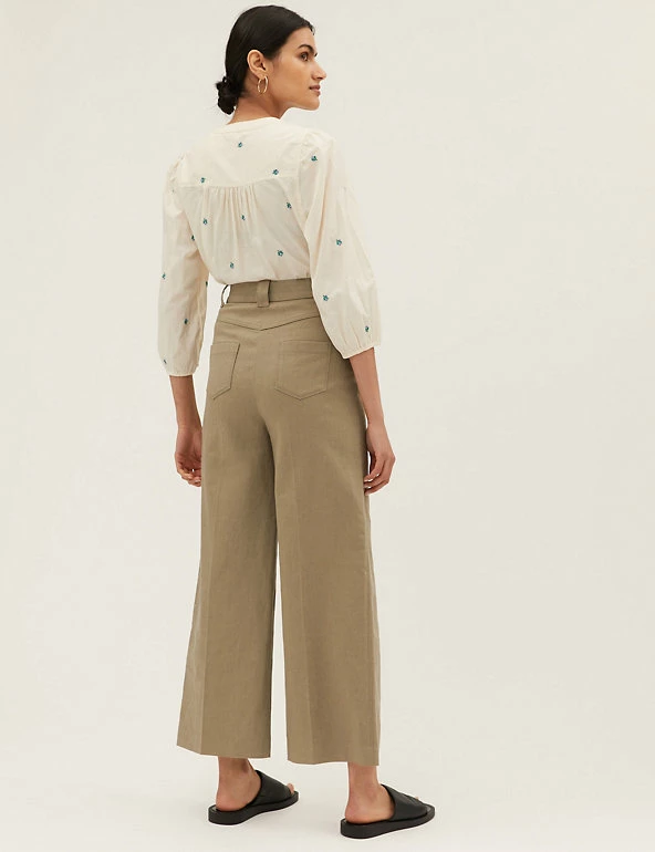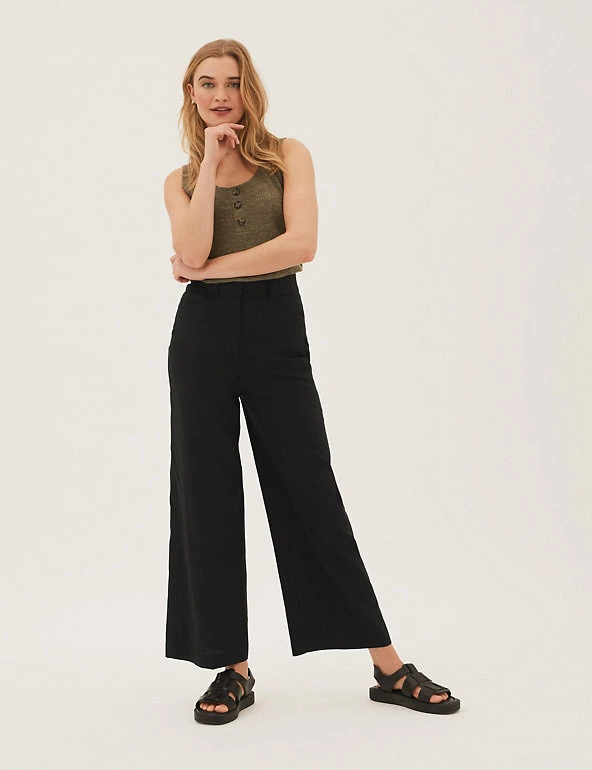 A breathable blend of linen and cotton gives these trousers a breezy feel. Wide legs graze the ankle and have handy pockets stitched into the sides and on the back. The flattering high waist is secured with a handy hook bar and zip fastening. We only ever use responsibly sourced cotton for our clothes.