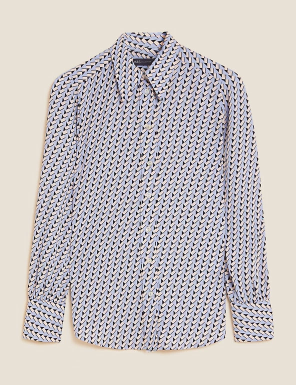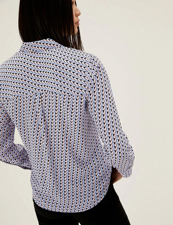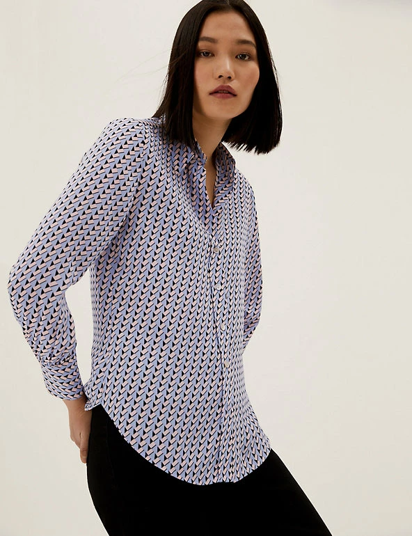 A jazzy geometric print gives this long sleeve shirt a stand-out look. Regular fit. Button-down front with gleaming shell buttons for a distinctive finish. Made with recycled polyester.