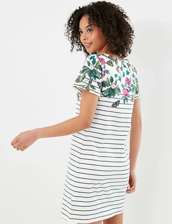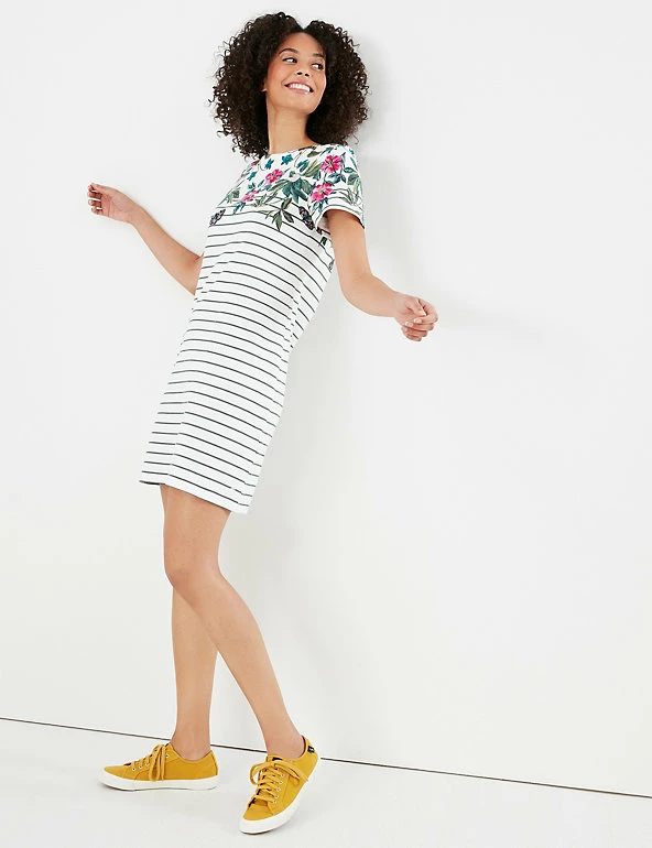 With a laid-back silhouette and pure cotton jersey fabric, this Joules t-shirt dress is made for sunny days. It’s cut in a comfortable regular fit, with an easy round neckline and short sleeves. The hem finishes at a casual knee length. Its all-over striped print is embellished with a fresh floral design at the top of the bodice.