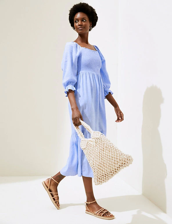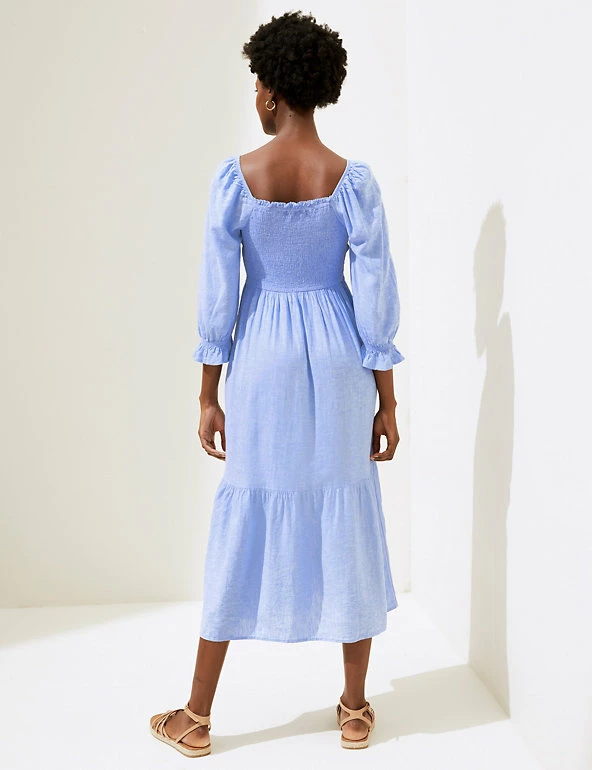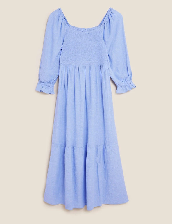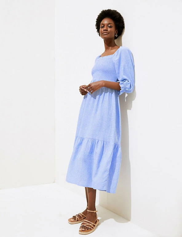 We’ve crafted this midi smock dress from a breezy linen blend for balmy summer days . It has a regular fit, with a shirred front and stretchy squared neckline to adapt to your shape. Tiers through the skirt and frills at the end of the short sleeves create a playful effect. Made with sustainably sourced viscose.
