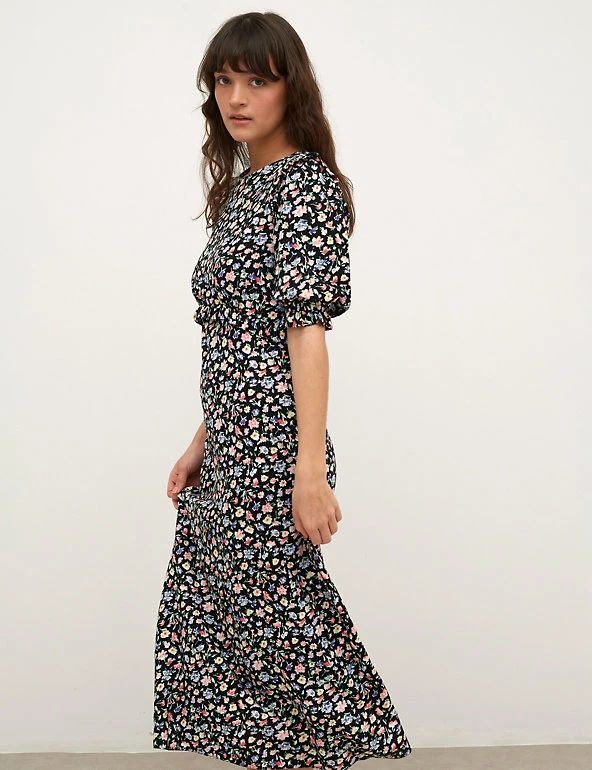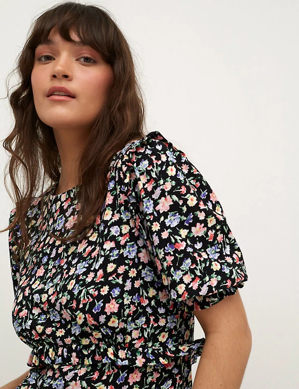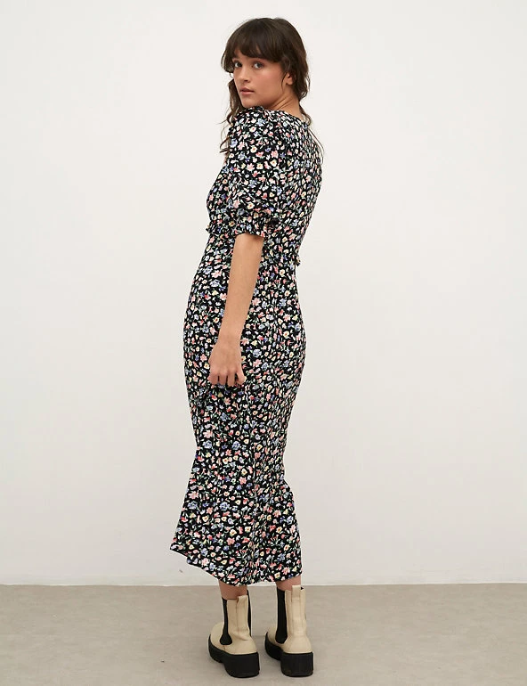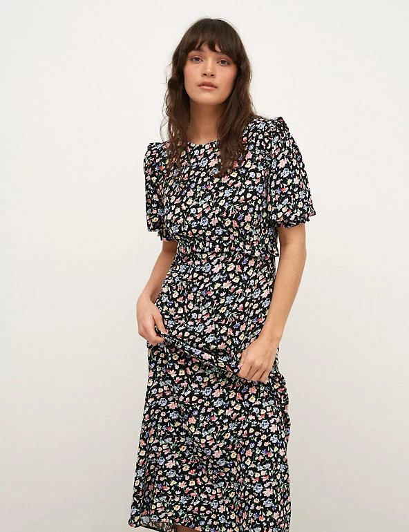 This Nobody’s Child floral tea dress will suit any occasion from weekday to weekend. It’s cut to a regular fit, with a simple round neckline and short, gently puffed sleeves. The pretty floral print, together with frill detail on the shoulders and waistline, makes this number stand out. It sits at a sophisticated midaxi length and fastens with a zip at the back. Made with sustainably sourced viscose. Nobodyβs Child designs are cut to a form-fitting shape, so if you’re looking for a more relaxed fit, we recommend choosing the next size up.