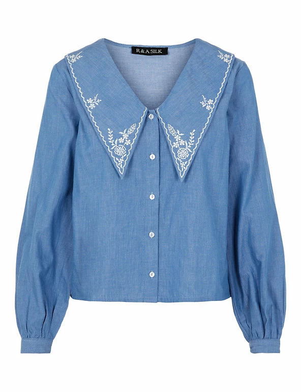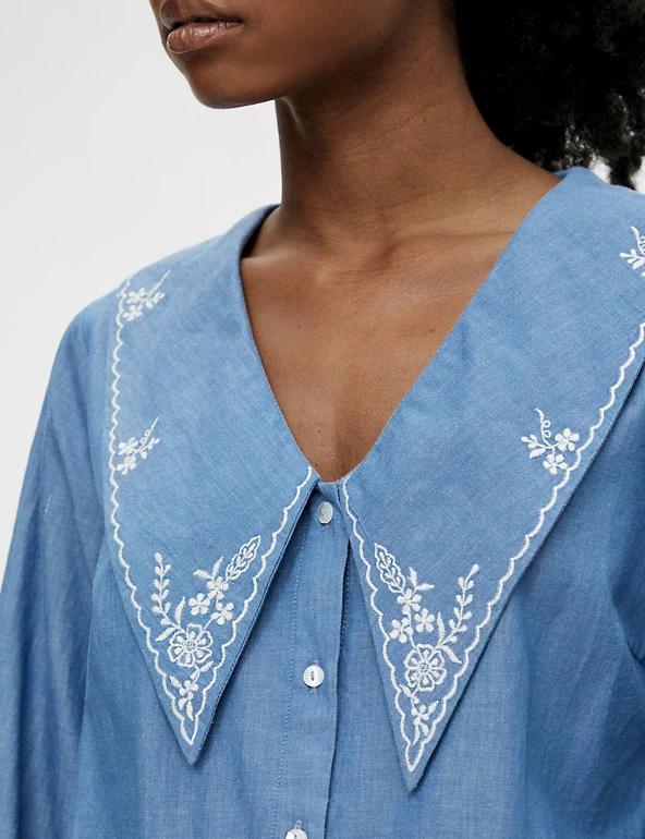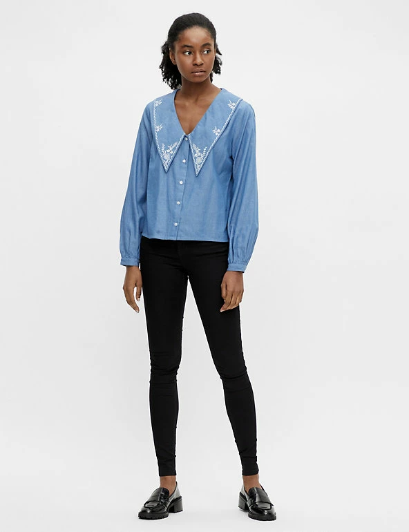 Lend some prairie charm to your wardrobe with this pure cotton top from OBJECT. It’s cut in a relaxed fit, with a button-through front and elegant v-neckline. Blouson sleeves and a statement collar with embroidery add a romantic feel.