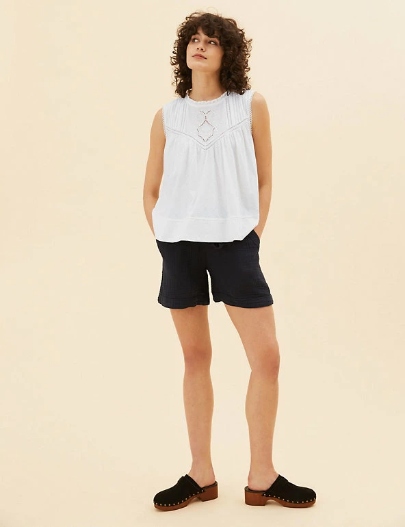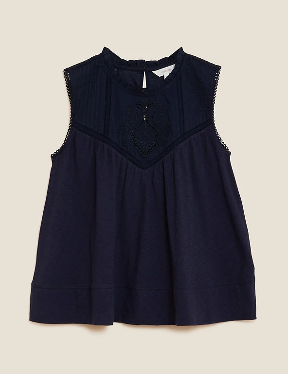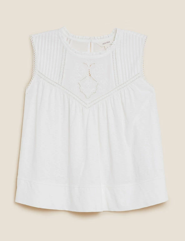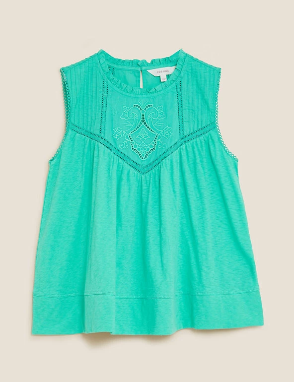 This pure cotton top from our Per Una collection is breathable and stylish. It has a regular fit with delicate embroidery over the chest and a subtle frill at the neck for elegance. Dainty trims line the sleeveless arms for a breezy feel and a back button fastening offers a neat finish. We only ever use responsibly sourced cotton for our clothes.
