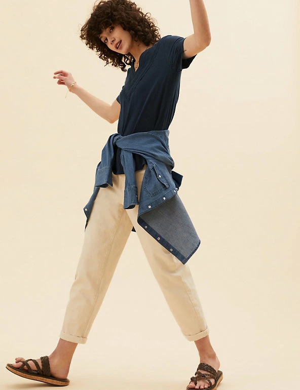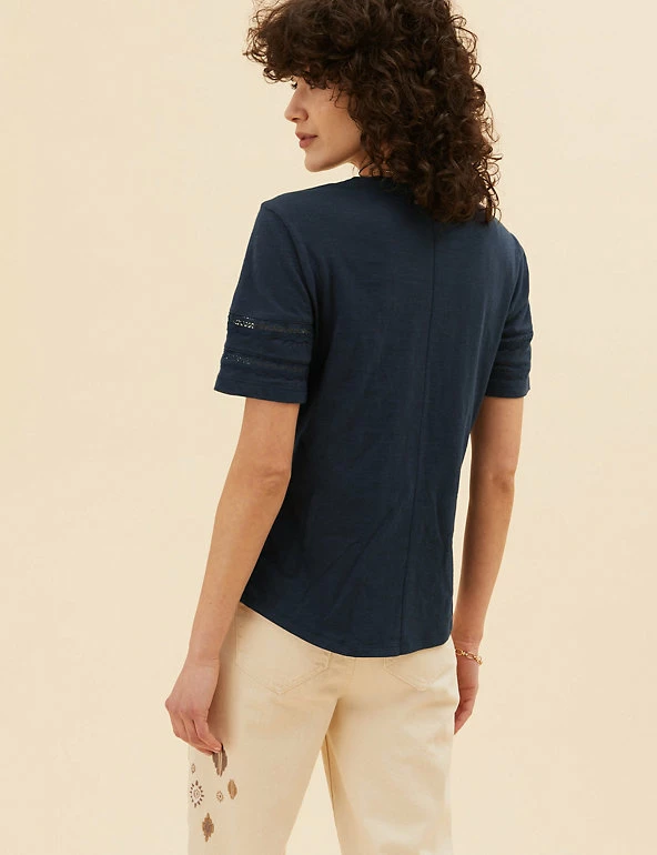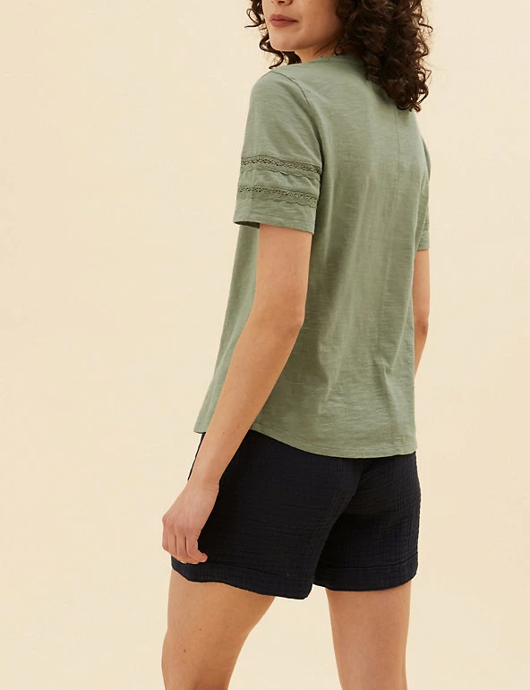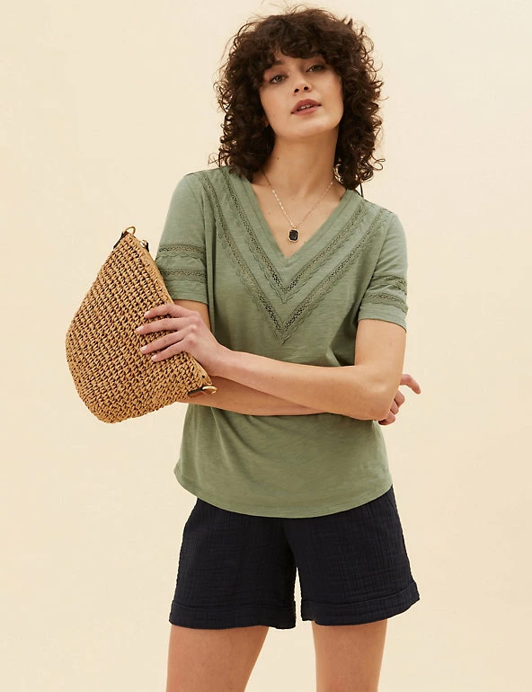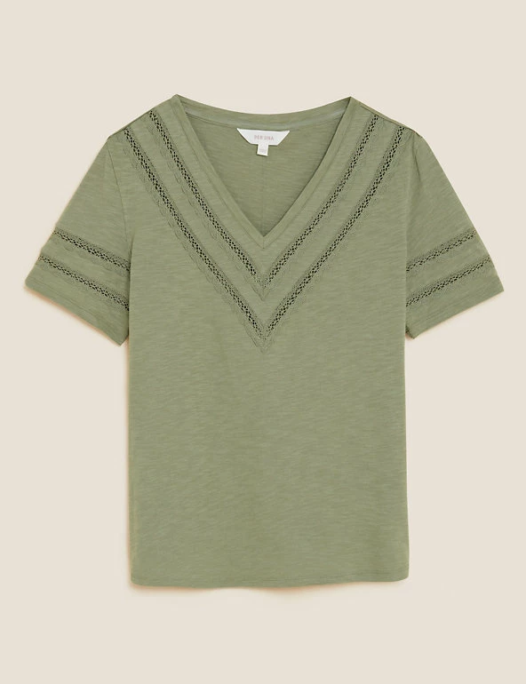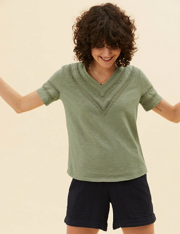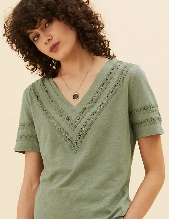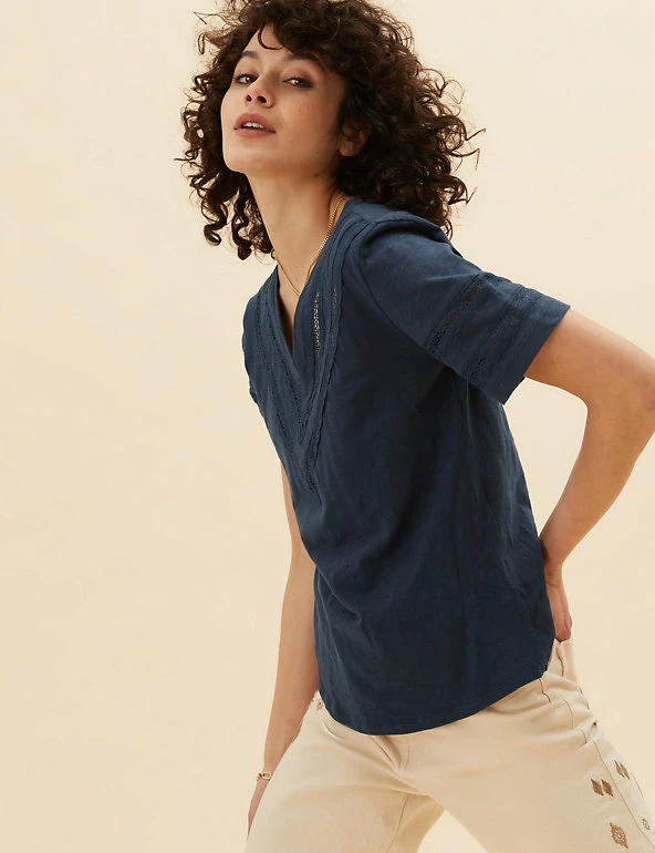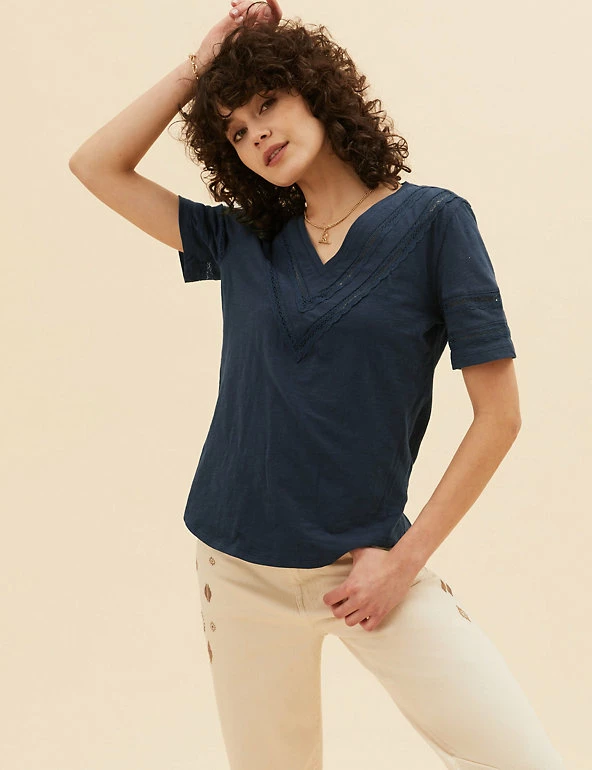 Elevate your basics with this breathable pure cotton t-shirt from our Per Una collection. It has a regular fit, with a flattering v-neckline. A slub texture brings a relaxed feel, while lace inserts at the neckline and cuffs add a pretty finish.