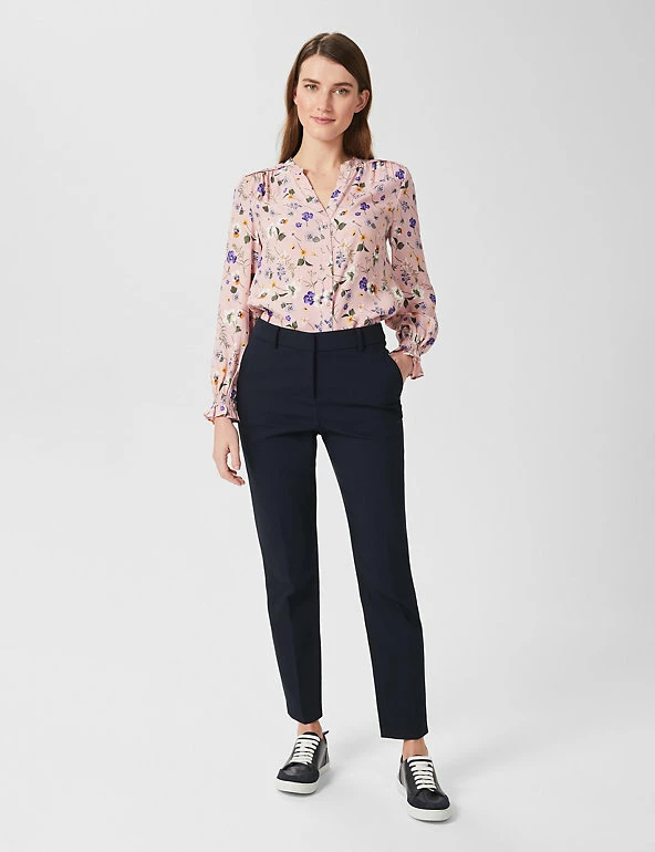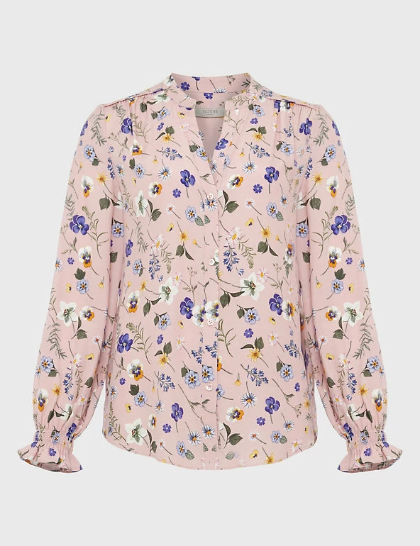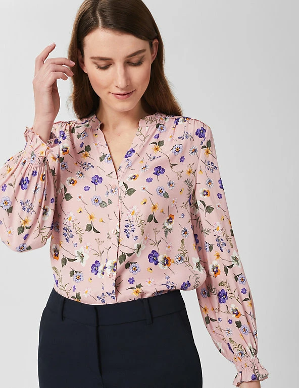 This Hobbs blouse has a gorgeously romantic feel with its soft floral print. It’s designed in an easy regular fit, with a feminine v-neckline and button-through fastenings. Gathers at the shoulders give extra draping. The long sleeves finish in delicate frilled cuffs, with shirring for a flexible wear. Made with sustainably sourced viscose.