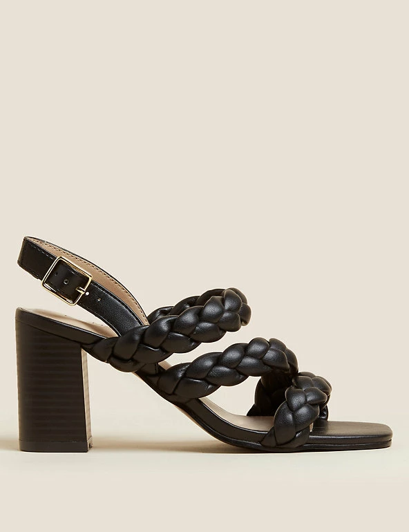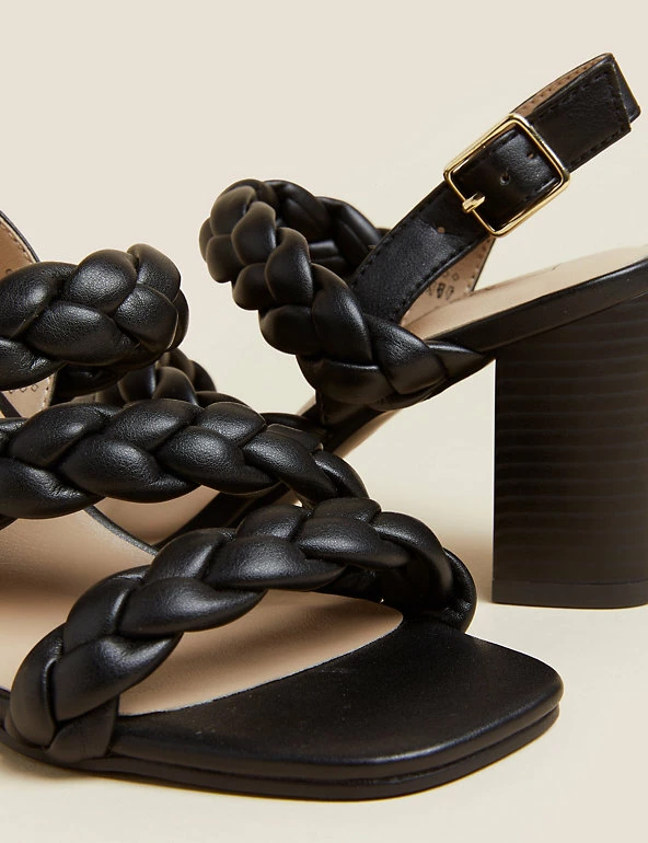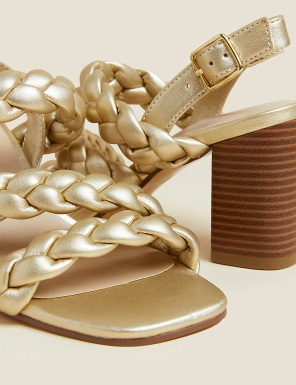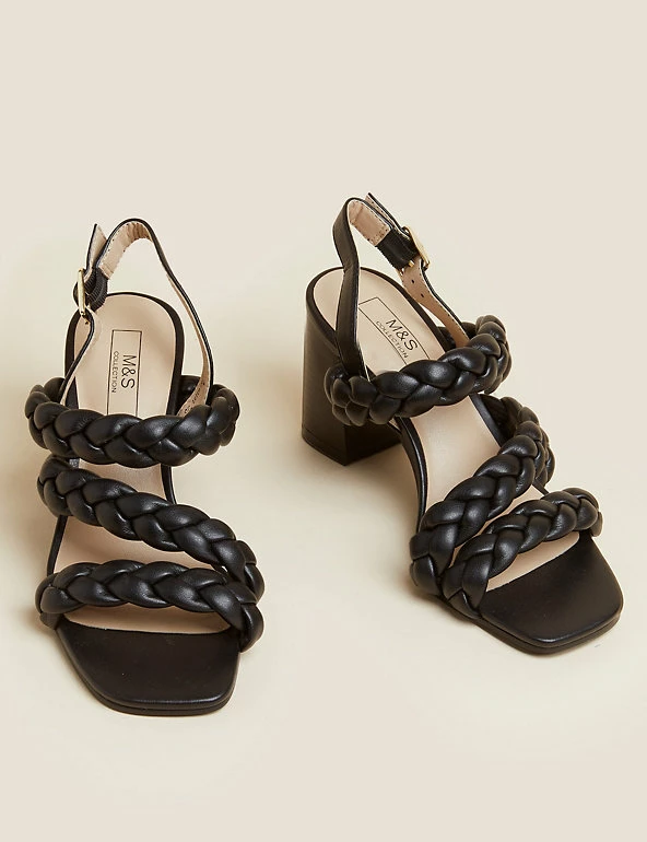 For sophisticated summer sandals, reach for this statement pair. They have a high block heel and clever Insoliaยฎ technology to help ease pressure from the balls of your feet for comfortable wear. Elegant woven straps and buckle fastening at the ankle for a secure fit.