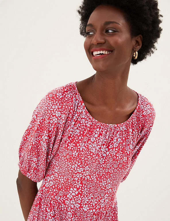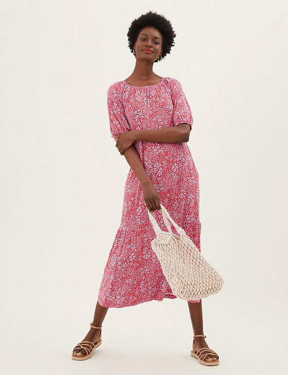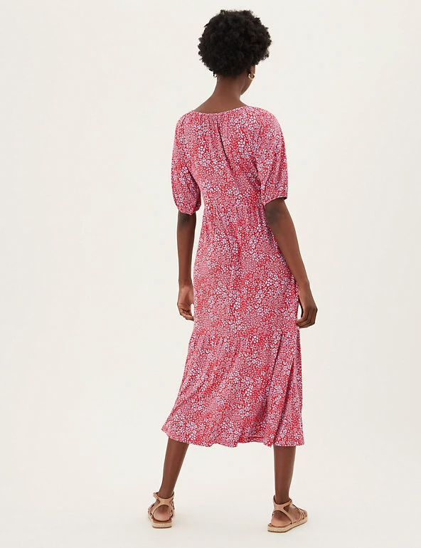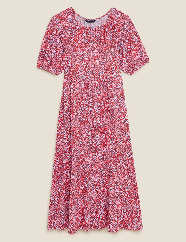 Slip into this floral midi dress for a playful summer look. It’s cut in a regular fit from lightweight jersey fabric with a tiered skirt for subtle shaping. Short puff sleeves add a touch of volume. A neat round neck offers a tidy finish. M&S Collection: easy-to-wear wardrobe staples that combine classic and contemporary styles.