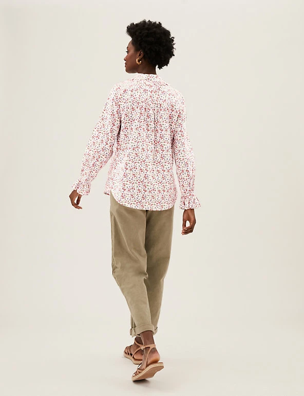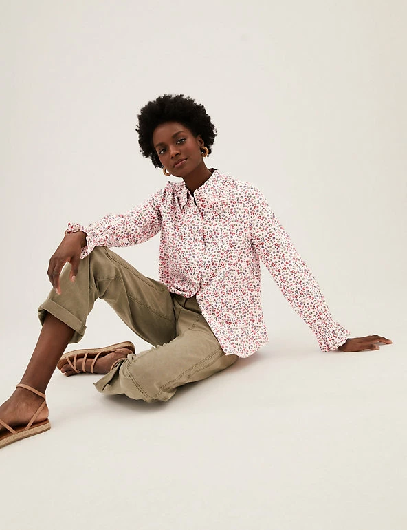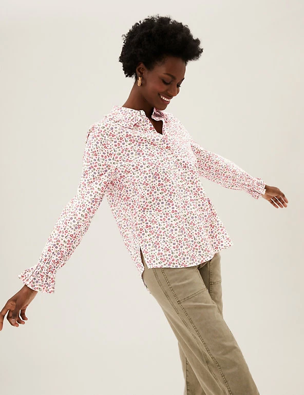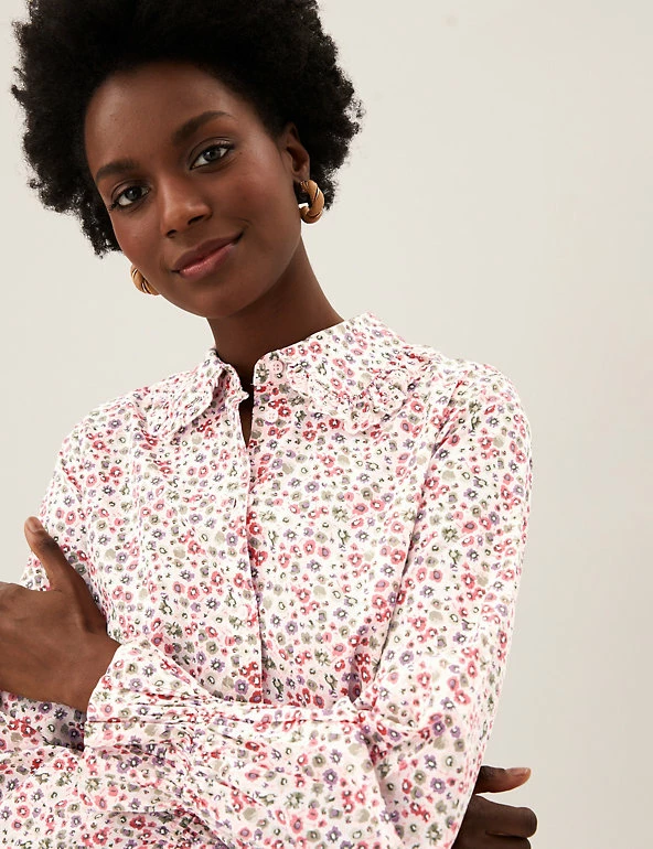 Add a playful pop to your outfit with this pure cotton shirt. Regular fit. Fun floral design as well as embroidered frills at the cuffs and collar. Finished with a high neck and a classic buttoned front. We only ever use responsibly sourced cotton for our clothes.