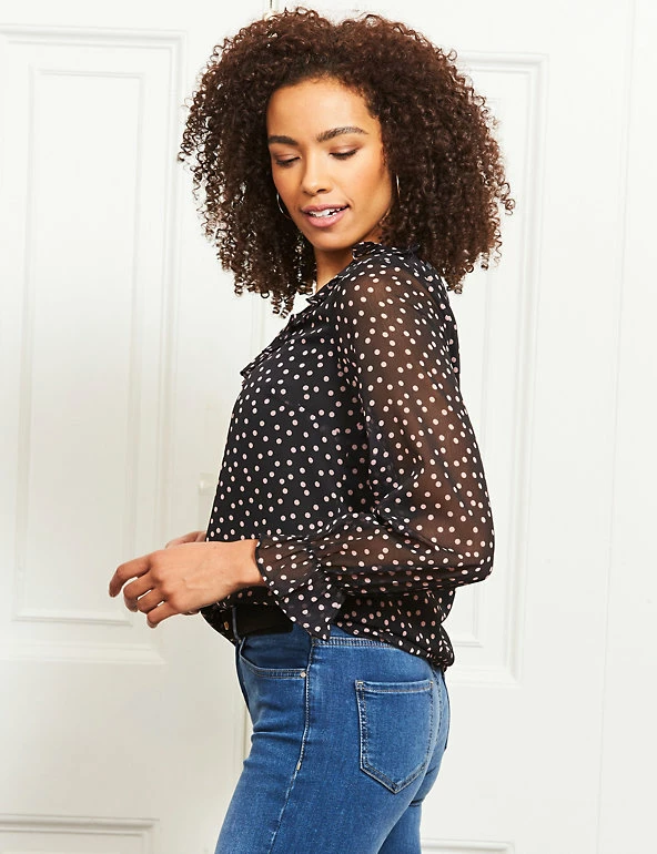 Create a statement in a classic polka dot print with this Sosandar blouse. It’s cut to an easy regular fit with a sophisticated v-shaped neck. Sheer long sleeves give a glamorous feel and are finished with pretty ruffle detail at the cuffs.