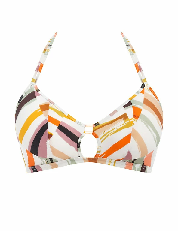 This Freya bikini top will keep you looking stylish from the beach to the pool. In a triangle shape with smoothing padded cups, the bikini is made for a fuller bust. It has an adjustable halterneck fastening and a playful cut-out at the centre front with gold square detail. The bikini top is decorated with an abstract striped print.