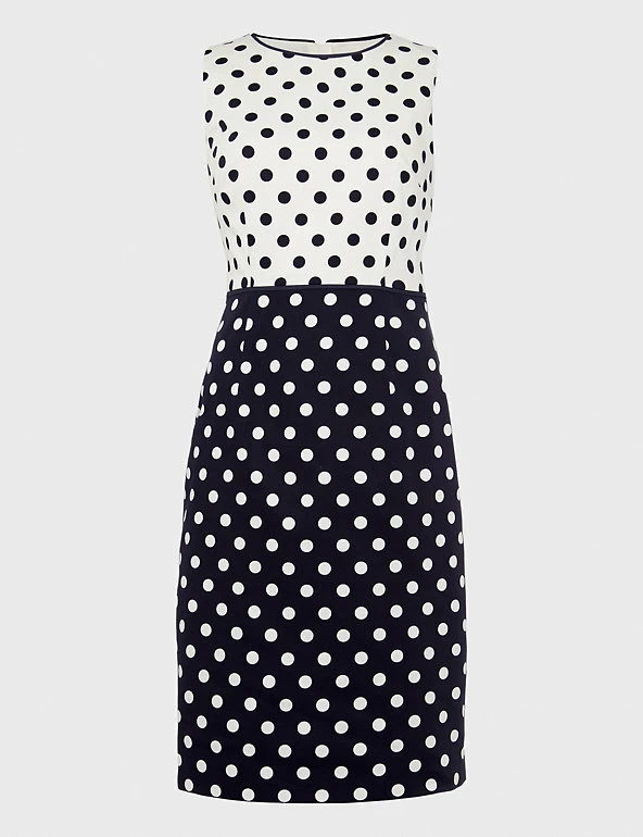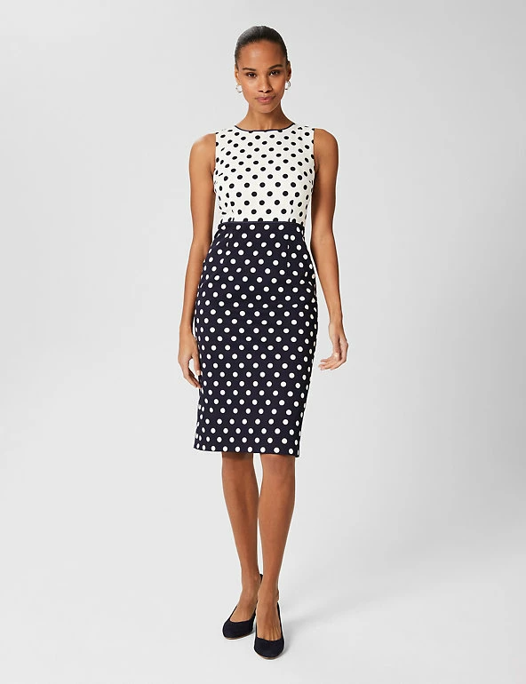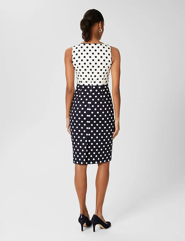 Stand out in bold polka dots with this eye-catching dress by Hobbs, made from cool, cotton-rich fabric. This sleeveless occasion dress is cut to a regular fit, with a flattering waisted silhouette and straight, knee-length skirt. The bodice and skirt are decorated with polka dots in contrasting colourways. Added stretch in the fabric ensures this piece feels comfortable for all-day wear. It fastens with a zip at the back.