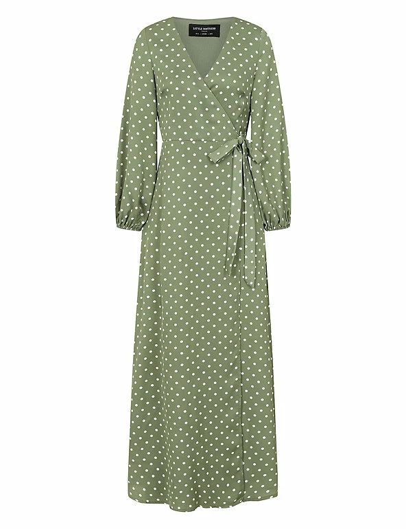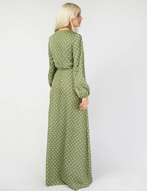 Embrace always on-trend polka dots with this timeless wrap dress by Vogue Williams X Little Mistress. Cut to a flattering regular fit, this piece features an elegant v-neck and a matching side tie fastening. Elasticated cuffs on the long sleeves create a gentle blouson shape and the maxi skirt is slit for an extra glamorous touch.