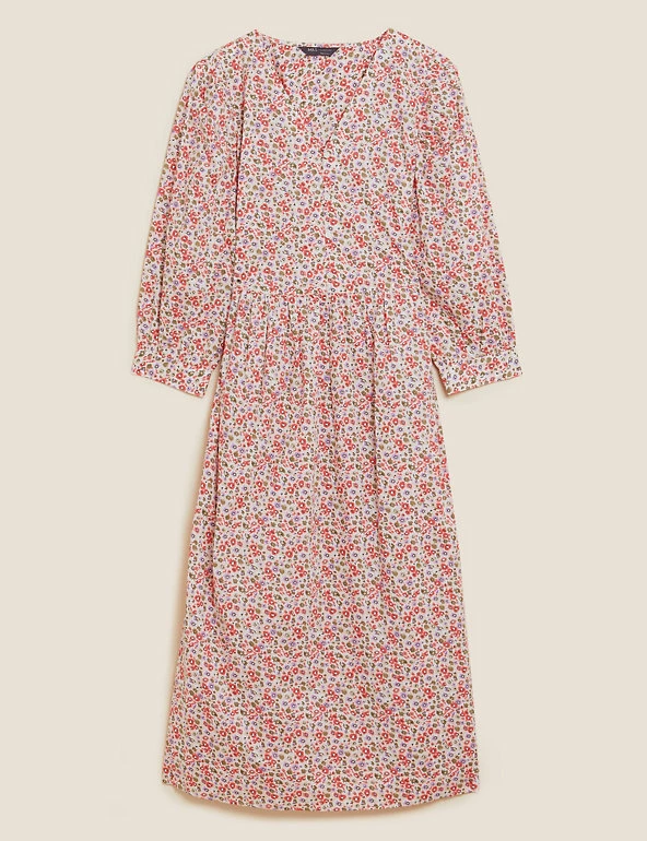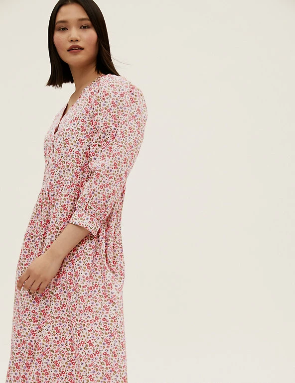 Create a laid-back look with this pure cotton midi dress. It’s designed in a relaxed fit with a playful ditsy floral print and 3/4 length puff sleeves for a touch of volume. Buttons lead down from the v-neck for a graceful finish. We only ever use responsibly sourced cotton for our clothes.