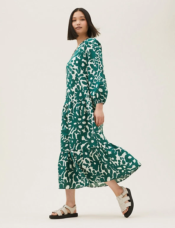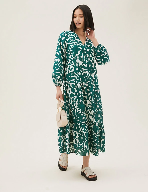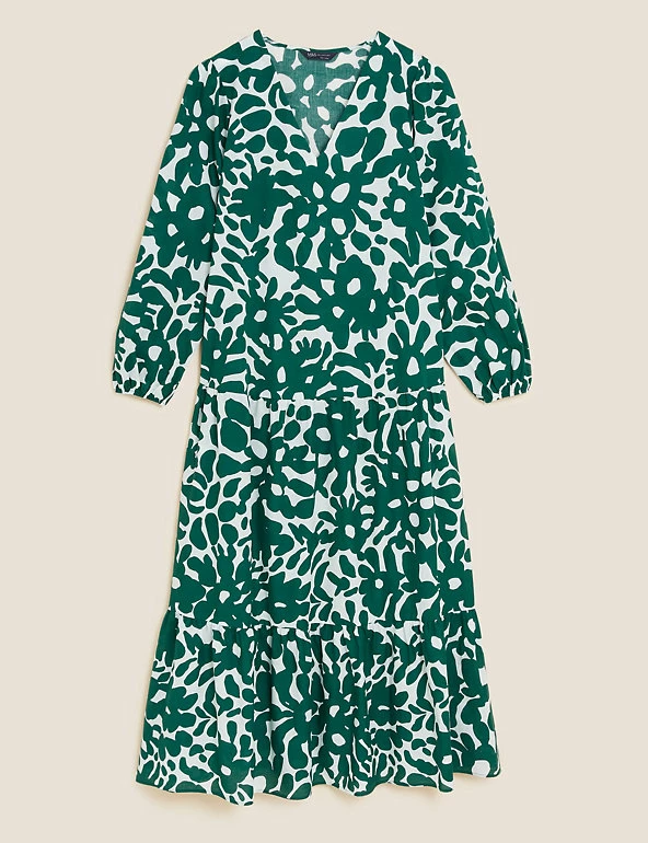 Bring stand-out print to your wardrobe with this pure cotton midaxi dress. It’s cut in a relaxed fit, with a casual dropped waist and long gathered sleeves. A v-neckline and tiers through the skirt create flattering shaping.