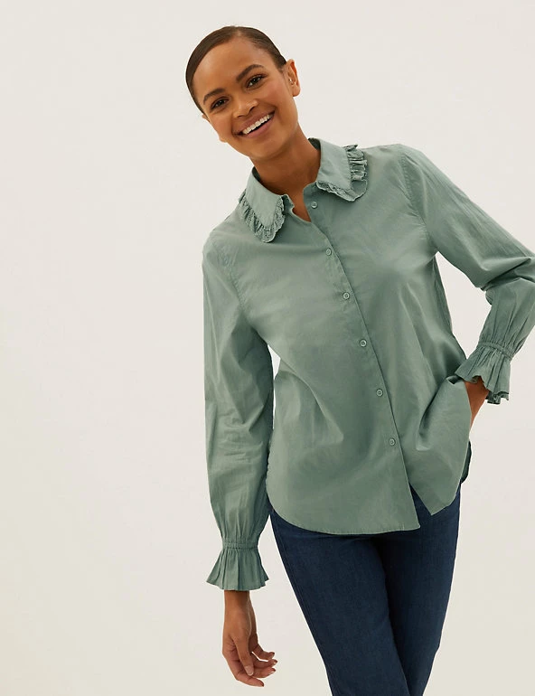 Button up this pure cotton shirt for an elegant effect. Regular fit, with embroidered frills at the collared neck and sleeve cuffs. We only ever use responsibly sourced cotton for our clothes.