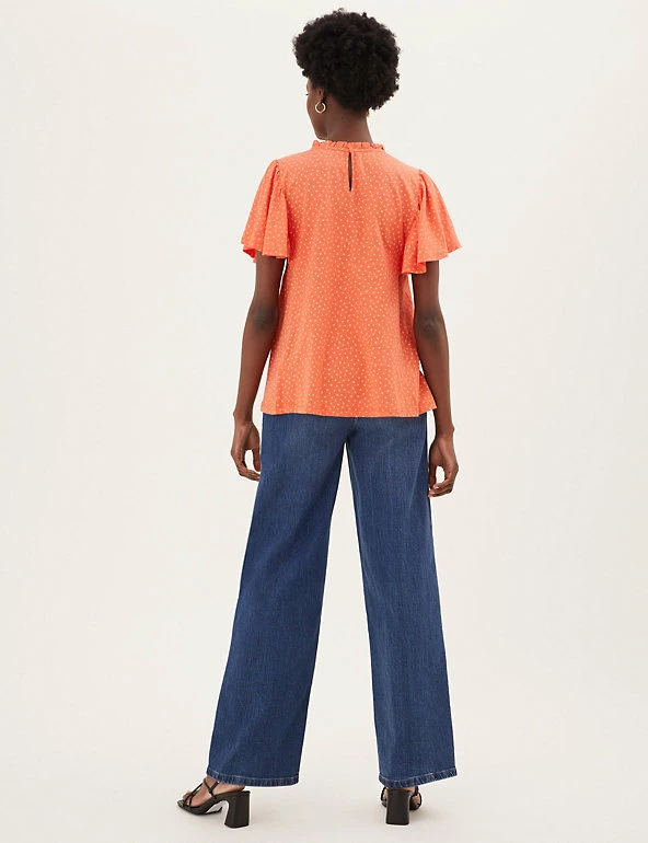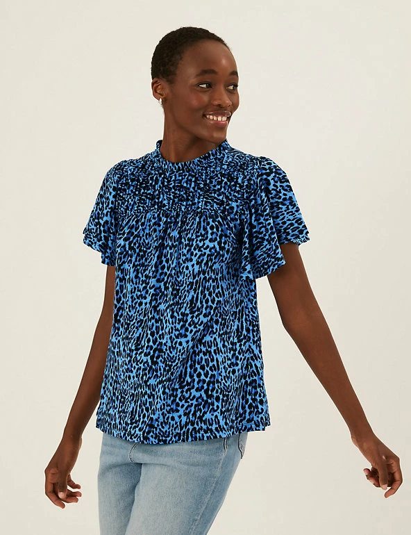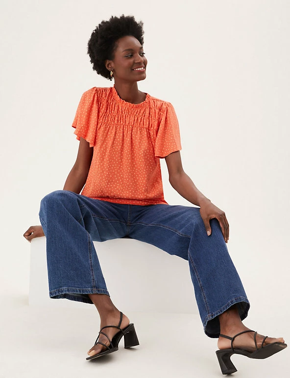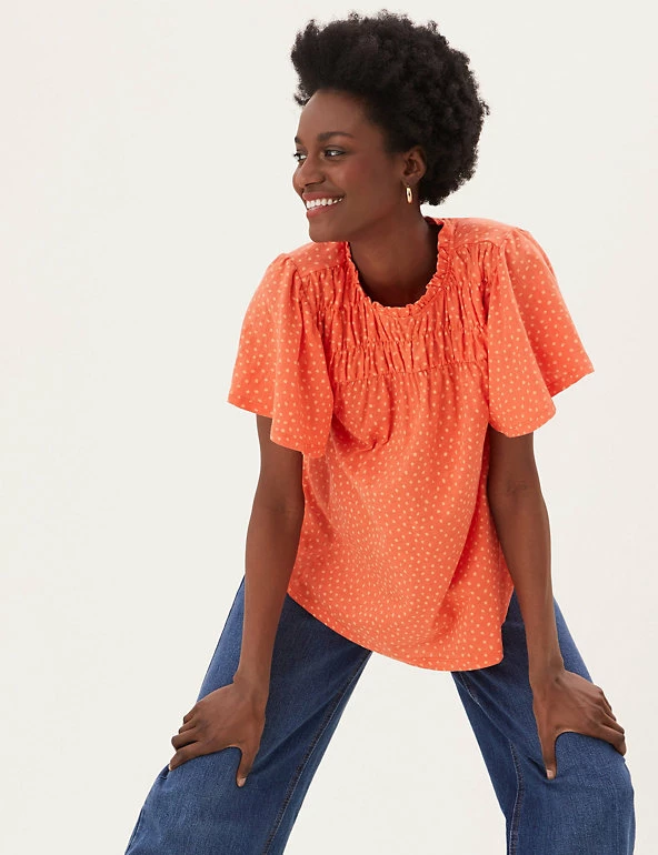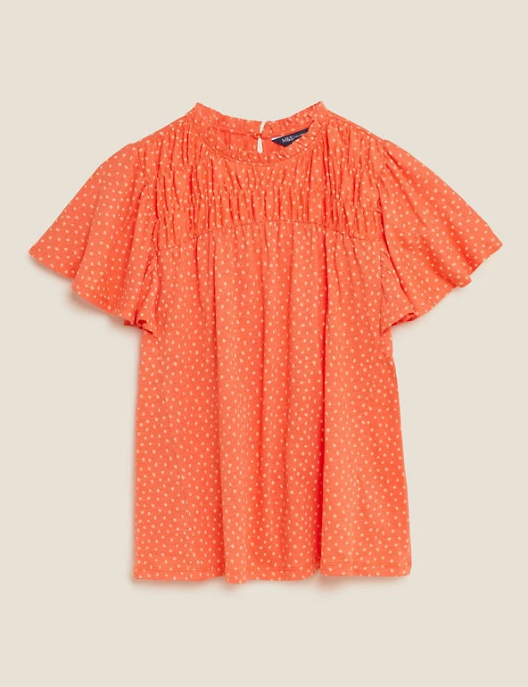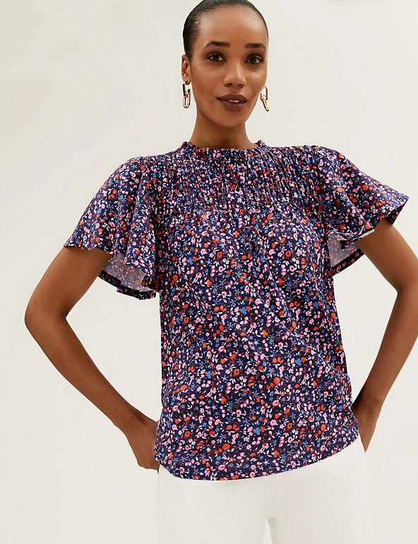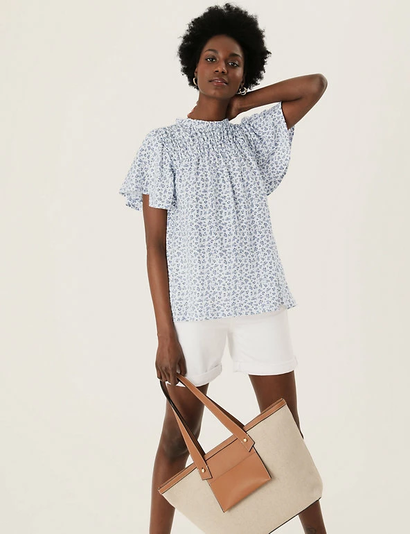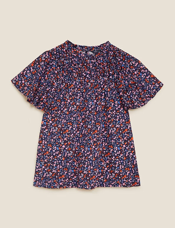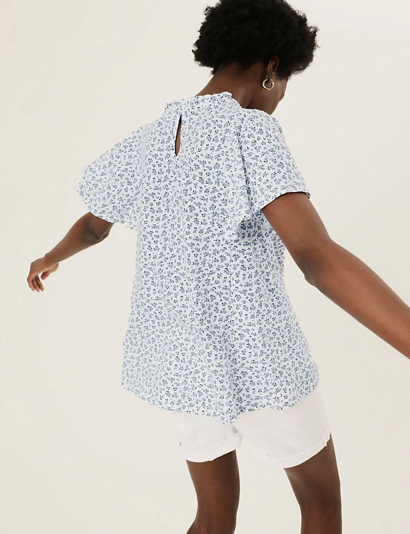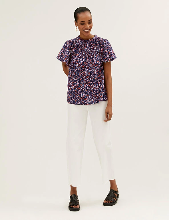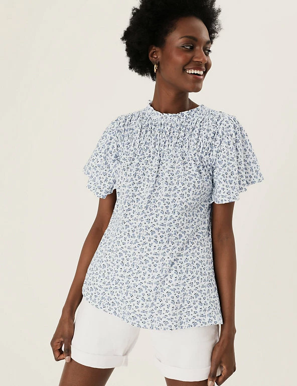 Bring a floral pop to your ensemble with this pure cotton top. Regular fit, with a shirred front panel and short ruffled sleeves for a fluttery feel. Crew neck gives a classic look. M&S Collection: easy-to-wear wardrobe staples that combine classic and contemporary styles.
