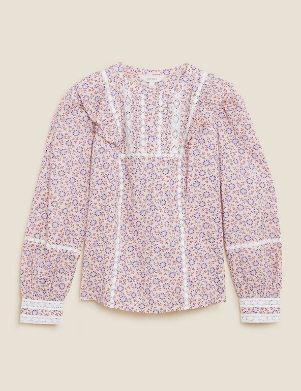 A striking print gives this pure cotton blouse from our Per Una range a striking look. Regular fit, with delicate lace inserts on the cuffs and chest, as well as feminine ruffles over the shoulders. A high neck and back button fastening give a neat finish. We only ever use responsibly sourced cotton for our clothes.