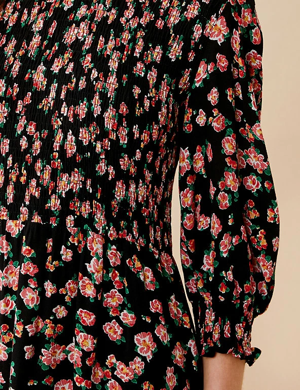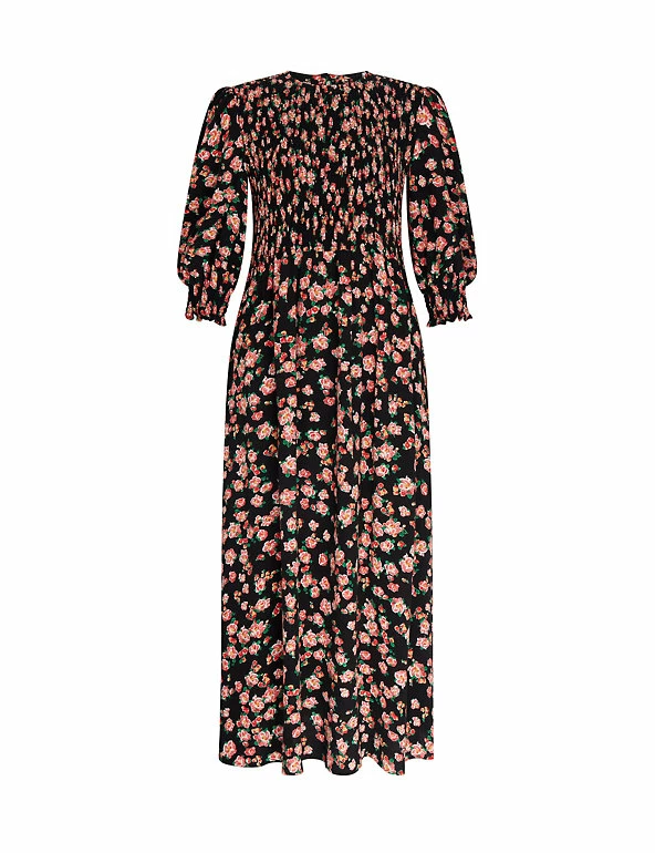 This Finery London dress flourishes with romantic florals. Cut in a regular fit, it hugs the body with stretchy shirring detail, before falling into a flowy midi skirt. Puffed 3/4-length sleeves with shirred cuffs bring a touch of volume to its silhouette. The dress is complete with a neat back button fastening.