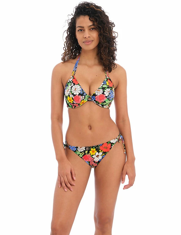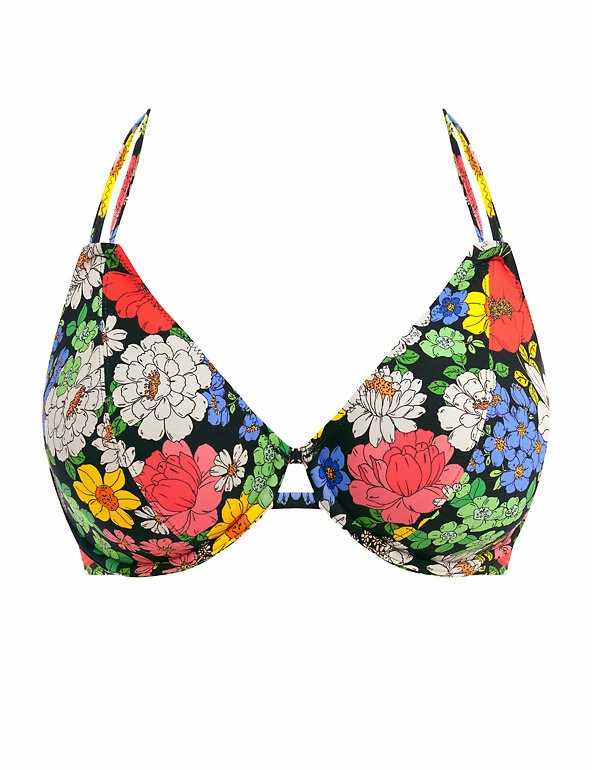 This plunging bikini top by Freya has a bold floral print for an instant statement feel. Designed with powernet-lined, underwired cups, itβs made to fit a fuller bust. The top has a halter tie closure around the neck and playful cut-out detailing on the front.