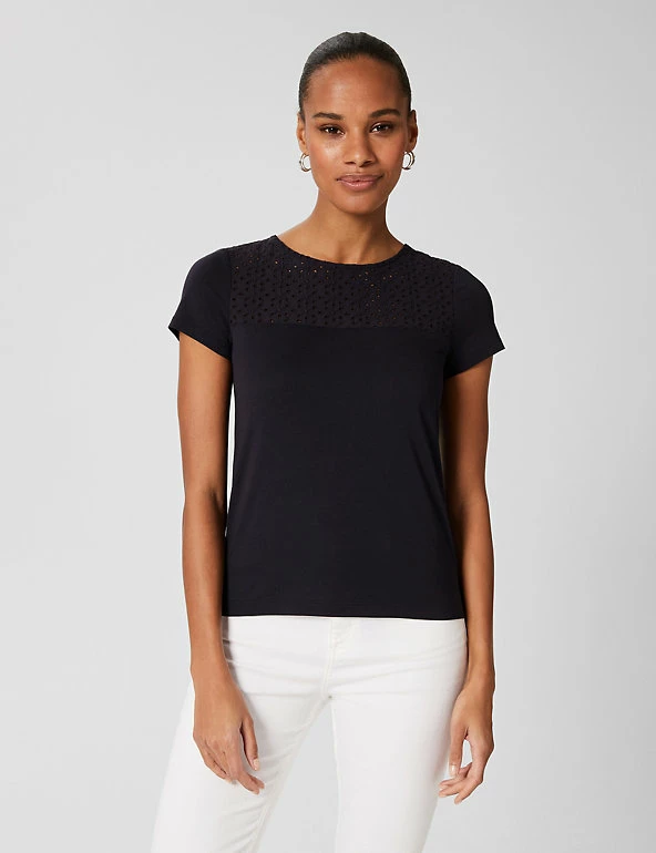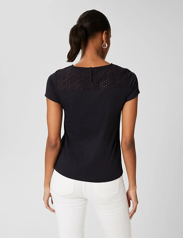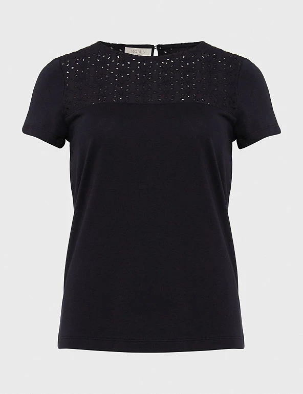 A touch of contemporary broderie detailing elevates this soft cotton-modal t-shirt from Hobbs. The understated piece is designed in a comfy regular fit and has a classic crew neck. It’s finished with a modern keyhole button closure at the back.