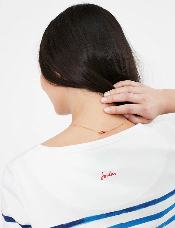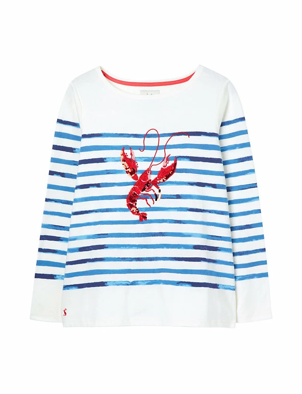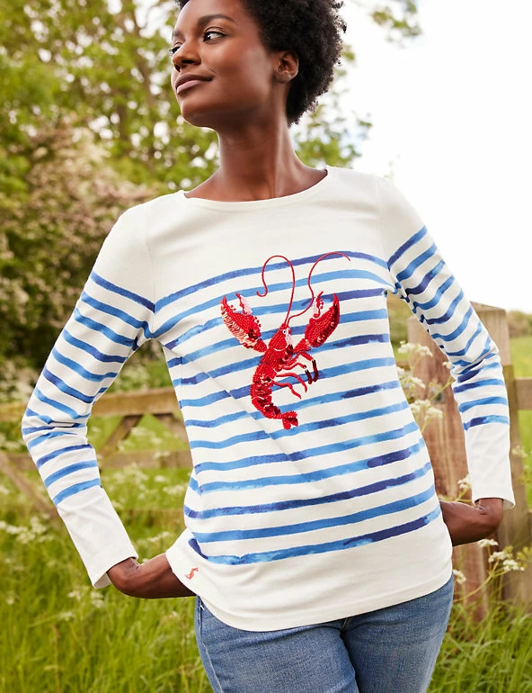 Add some coastal-inspired style to your casual outfits with this pure cotton jersey top from Joules. The relaxed fit creates an effortless look, complemented by the long sleeves and sophisticated slash neck. It has a striped print featuring an intricate sequin-embellished lobster.