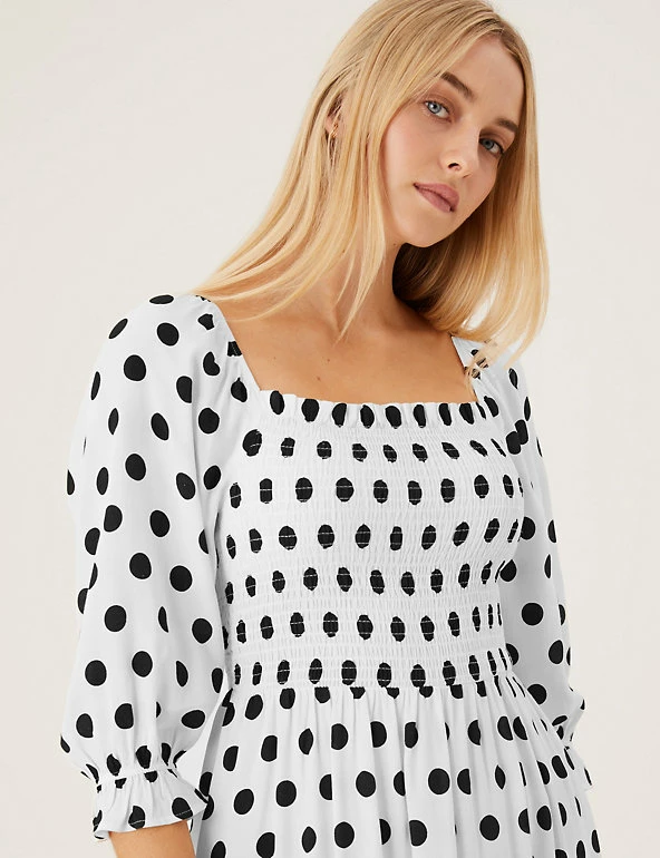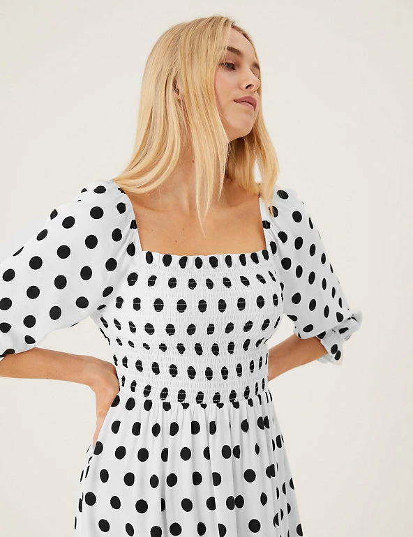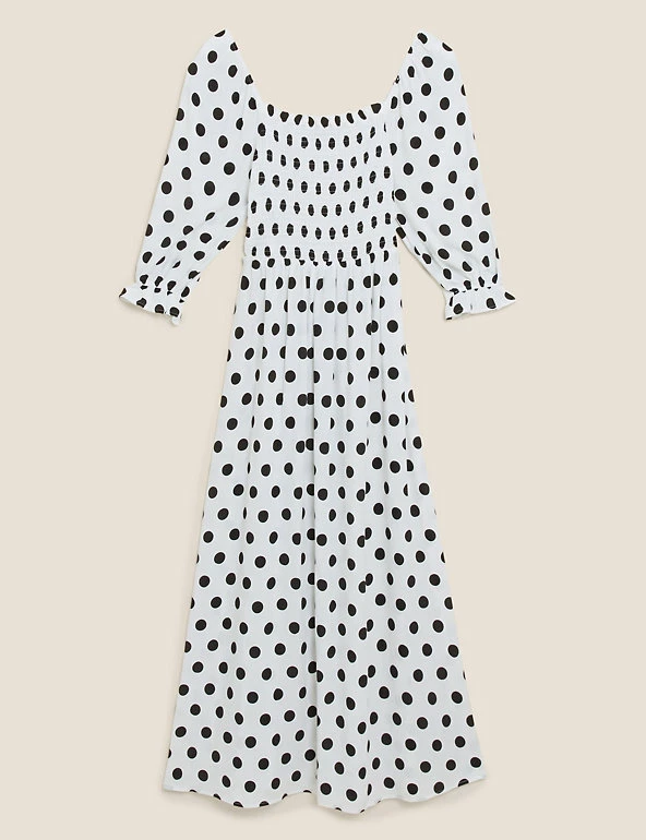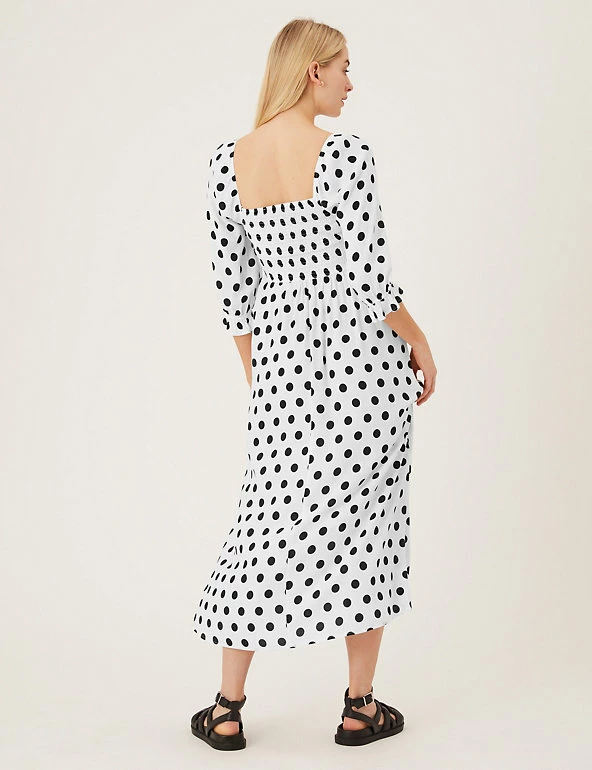Make a statement in polka dots with this classic dress. The regular fit design features shirring across the bust for an elegant silhouette. It falls to a flattering midaxi length and is complete with three-quarter sleeves and a sophisticated square neck.