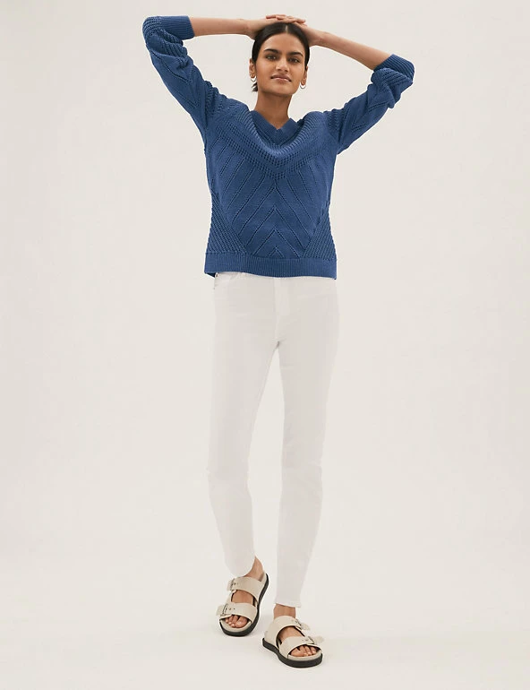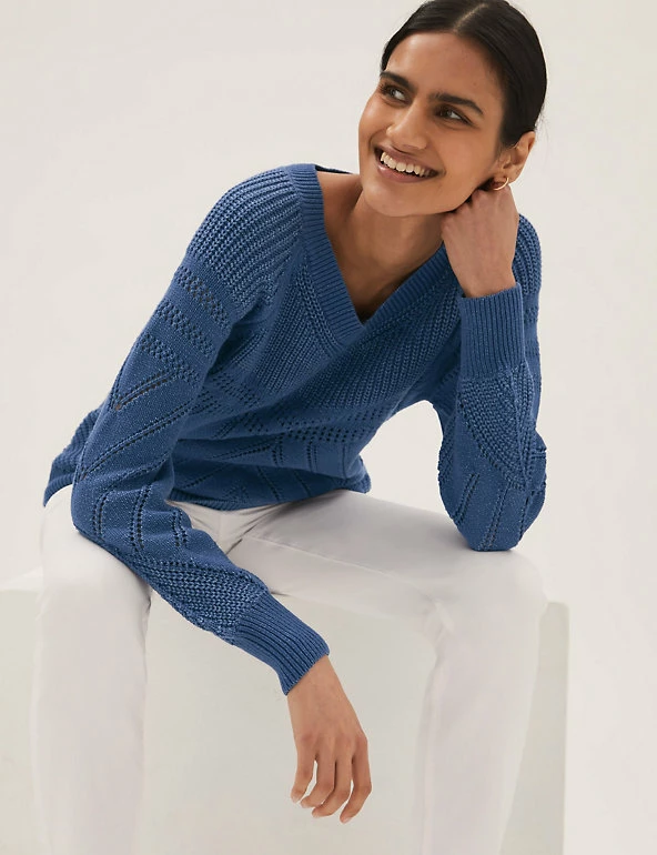 For an extra cosy feel, reach for this cotton-rich jumper. It has a relaxed fit and an all-over textured knit for an irresistibly snuggly effect. You’ll find ribbing at the v-neck and cuffs to lock in heat on chilly days. We only ever use responsibly sourced cotton for our clothes. Made with recycled nylon.