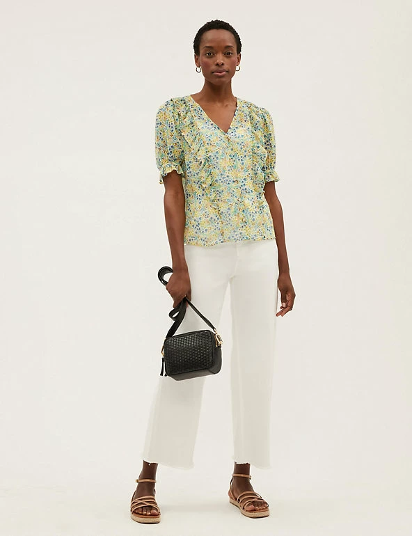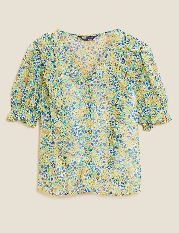 Bring a pop of print to your outfit with this floral v-neck blouse. Regular fit, with a camisole layer for comfort and button-down front for easy wear. Featuring a fun ruffle on the cuff of the short puff sleeves.