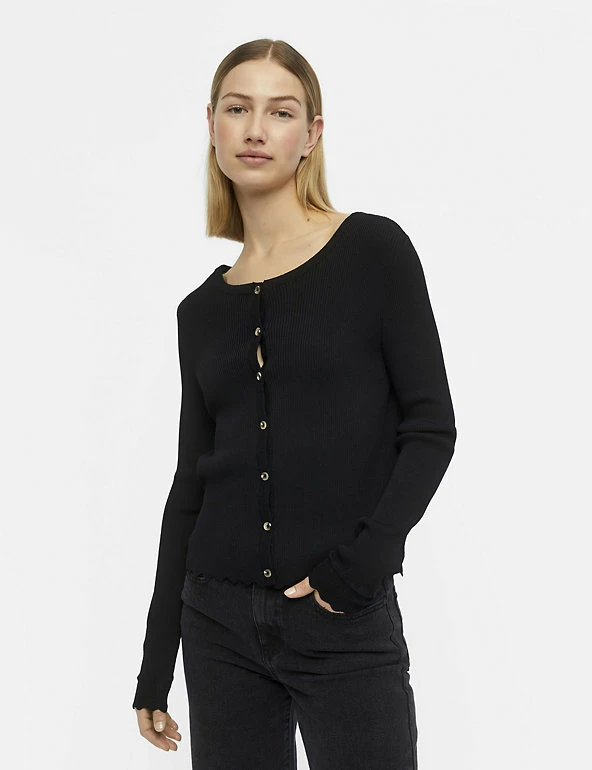 Layer up your look with this chic knitted cardigan from OBJECT. It’s cut to a regular fit, with a classic button-through fastening and flattering crew neckline. Scalloped hems give a feminine finish. Made with sustainably sourced viscose.