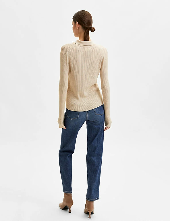 This cosy cardigan by SELECTED FEMME sports a modern rib-knit texture. Fitted for a flattering look, this versatile piece features a smart collared neck and warm long sleeves. Contrast buttons down the front bring a contemporary finishing touch.