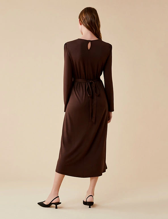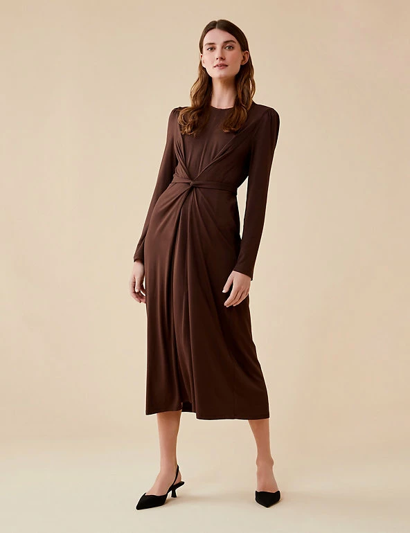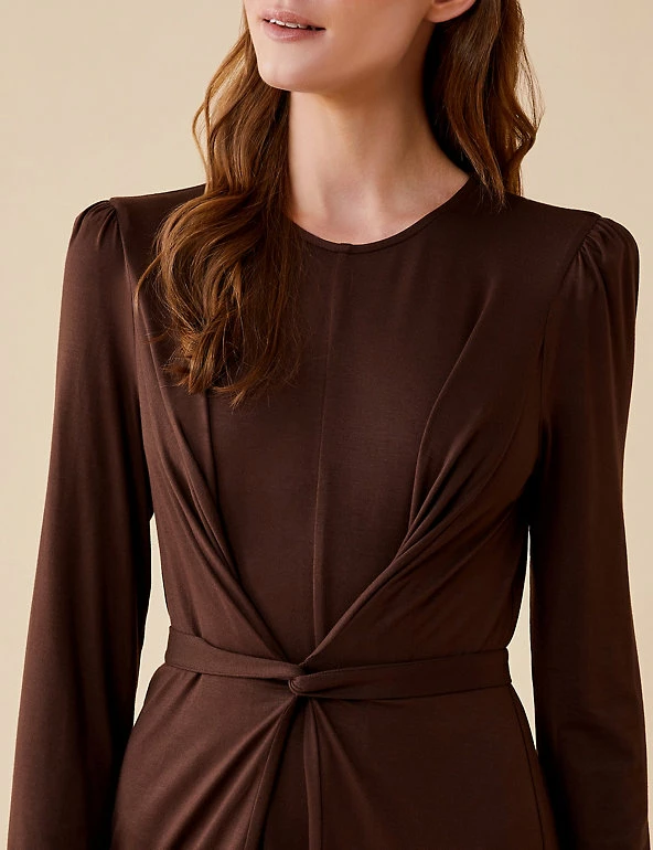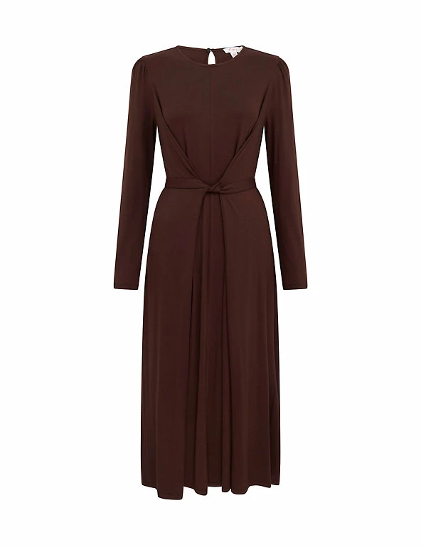 This figure-flattering waisted dress by Finery London is sure to turn heads at events. Designed in a regular fit, this understated midi-length piece has a simple round neck and elegant long sleeves to beat the chill. Knotted detail at the waist draws in the fabric to create a sophisticated hourglass silhouette.