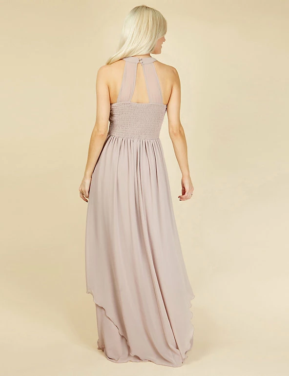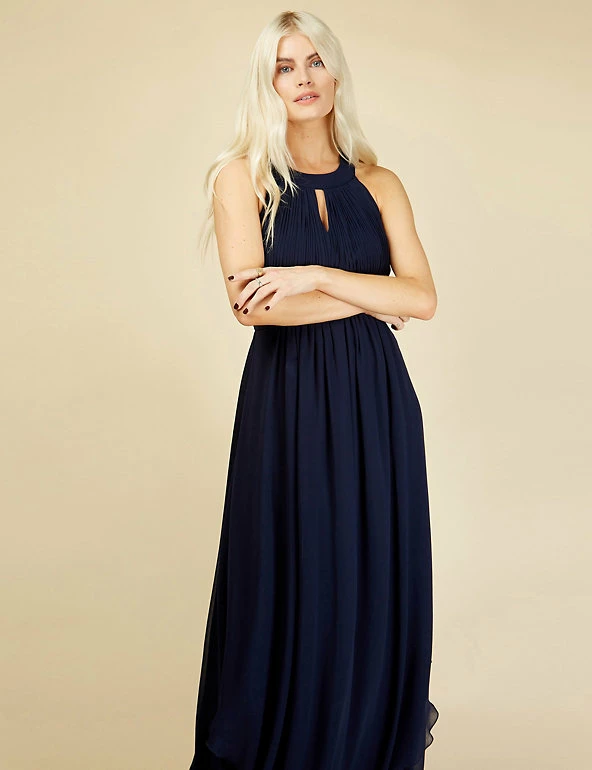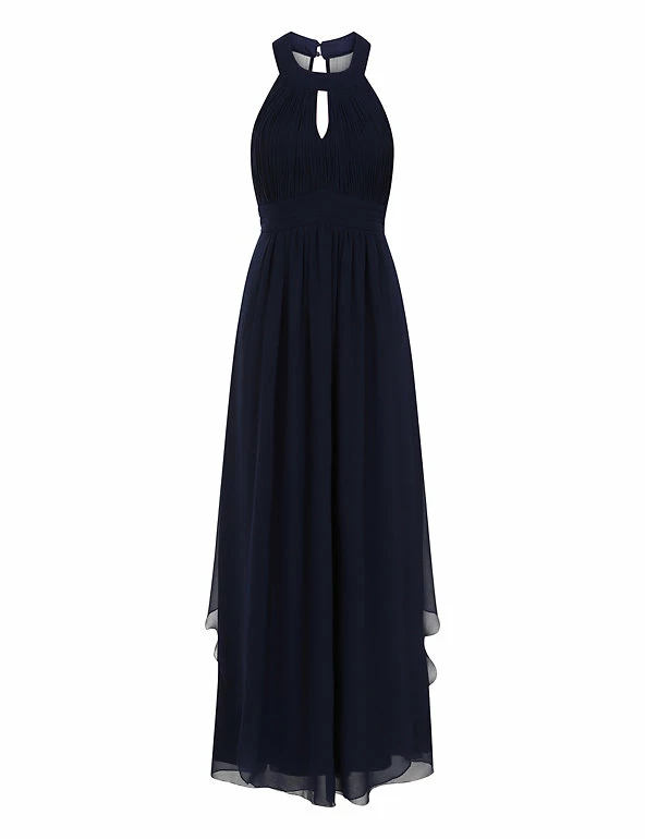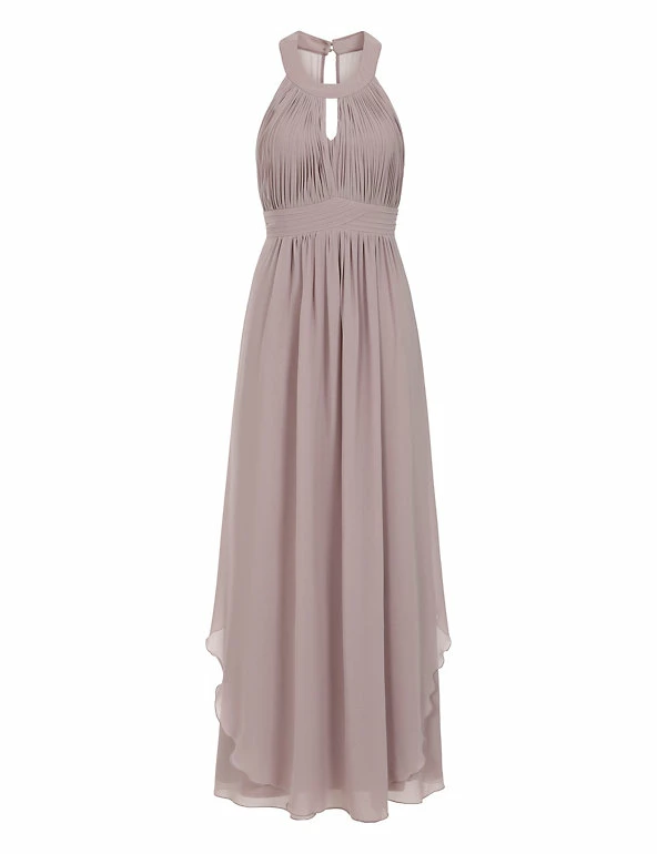 This beautiful maxi dress from Little Mistress is a great choice for special occasions like weddings and proms. It’s cut to an effortless regular fit, with a classic round neck and a sleeveless design. Ruching on the bodice and horizontal pleating on the waistband add a flattering touch. Keyhole detailing at the front and back gives this style a modern touch, and the floor-sweeping hem is layered for extra movement.