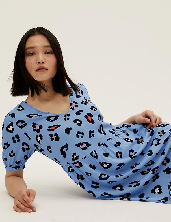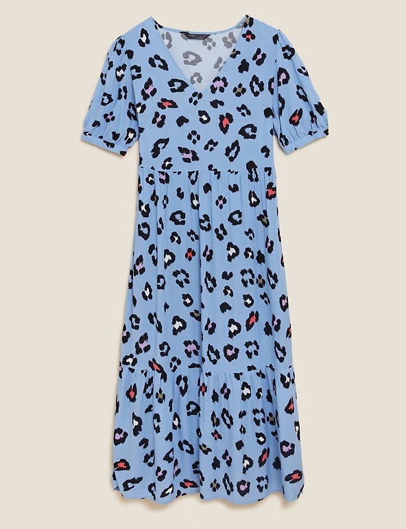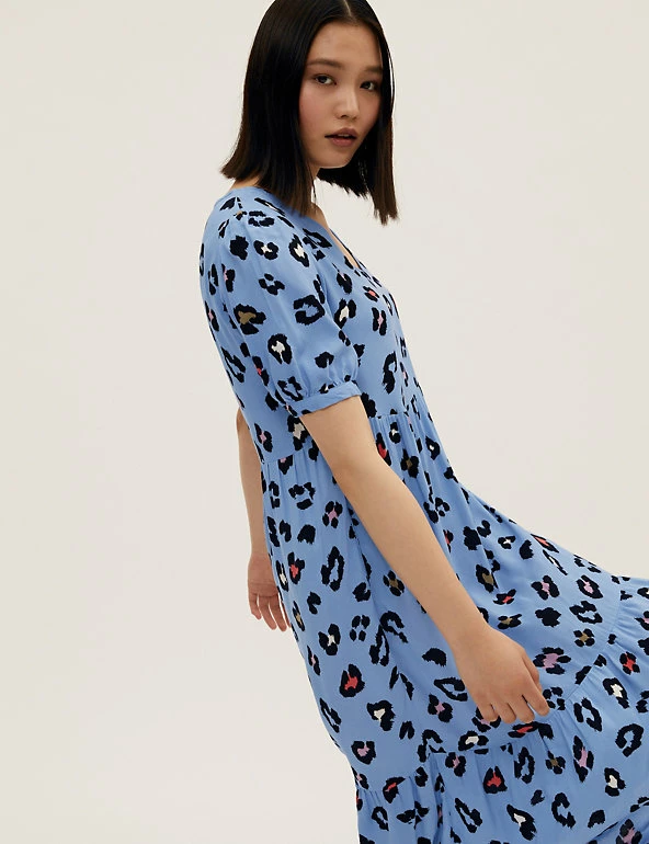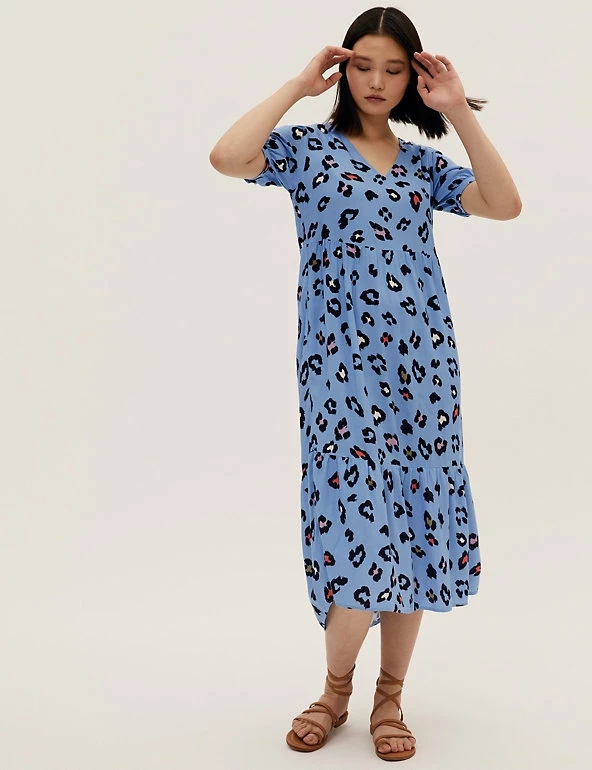 A bold animal print meets a playful pop of colour in this midi dress. It has a relaxed fit and tiers through the skirt for a swishable effect. The short puff sleeves add a hint of volume, while the neat v-neck creates an elegant finish. Made with sustainably sourced viscose.
