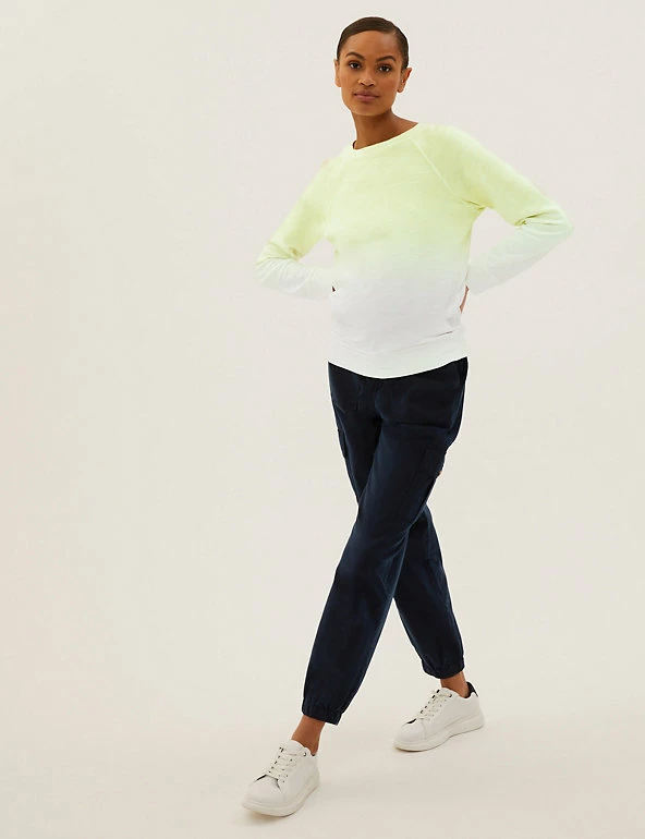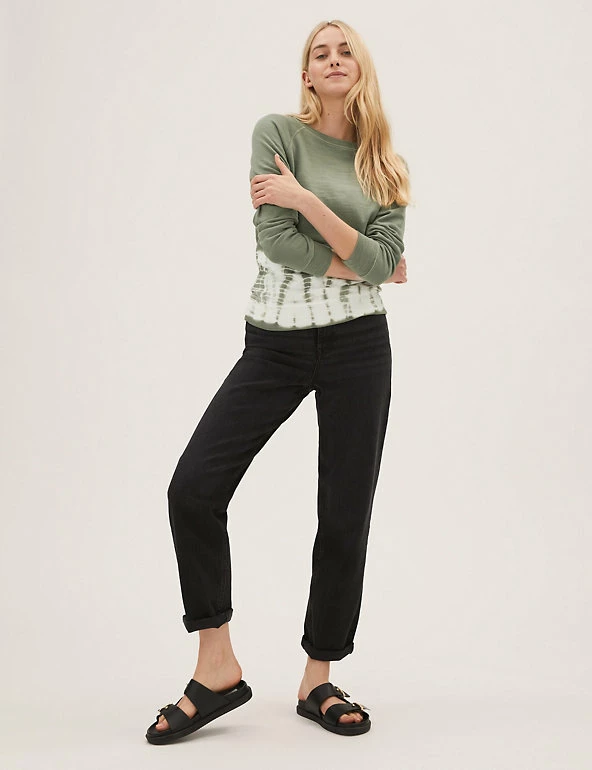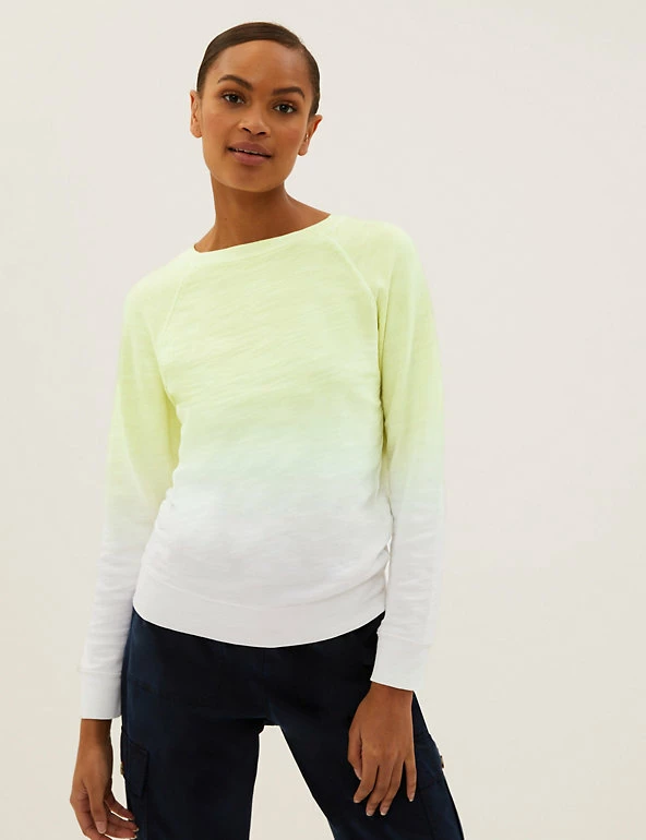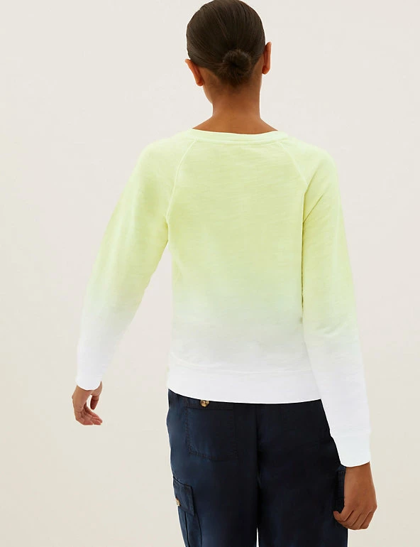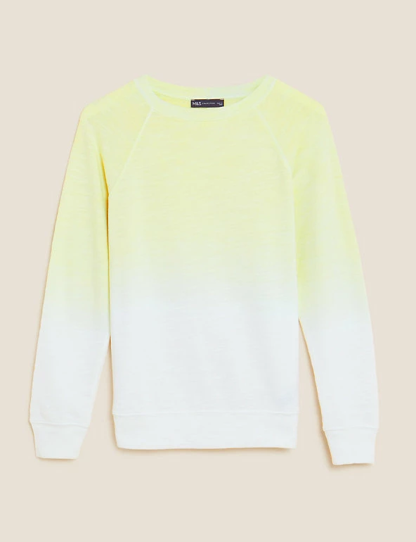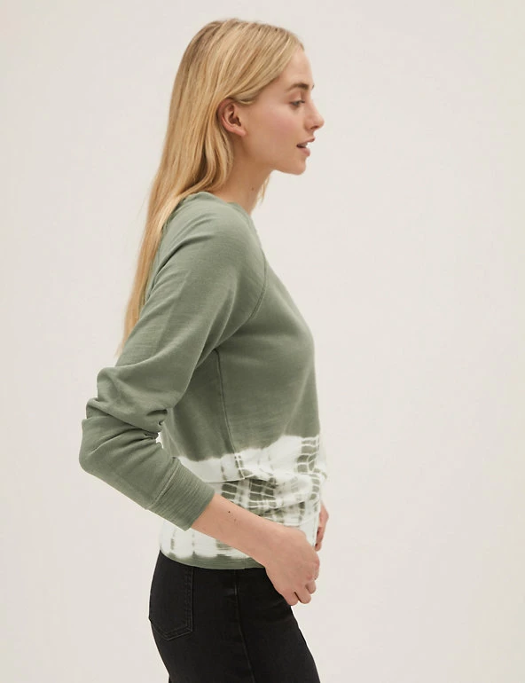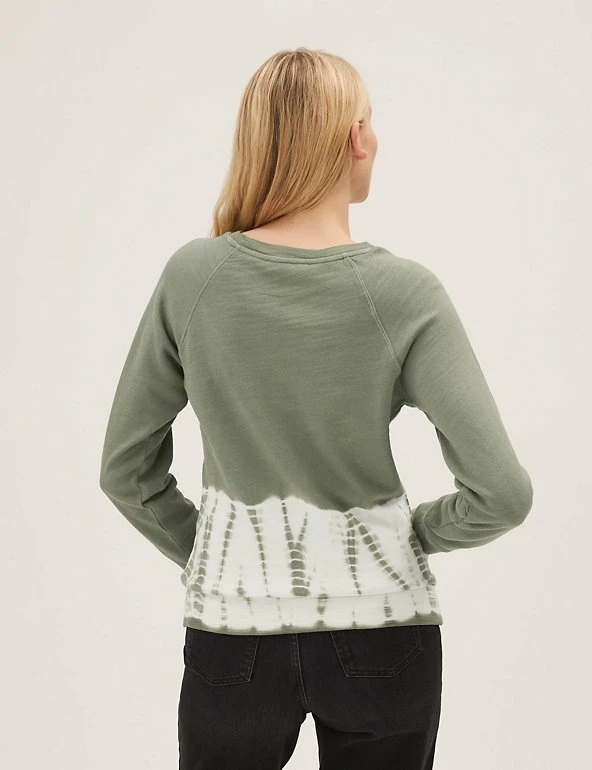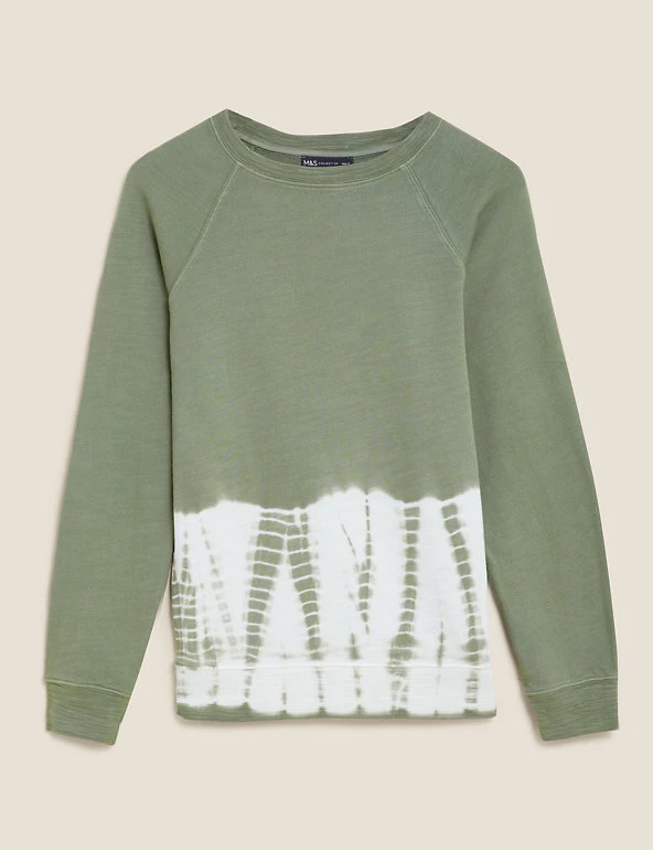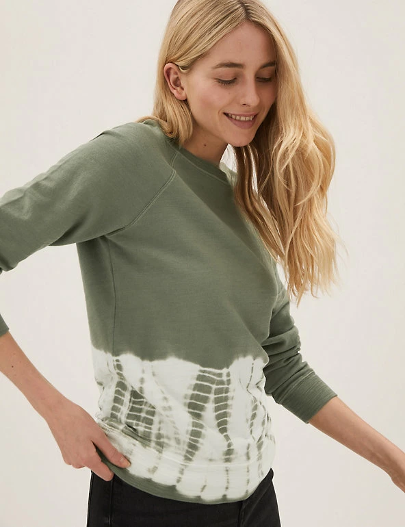 With its tie dye strokes, this pure cotton sweatshirt adds a little edge to your look. Comfy regular fit, with a classic crew neck and long raglan sleeves. Cosy slub texture and ribbed trims keep you snug. We only ever use responsibly sourced cotton for our clothes.