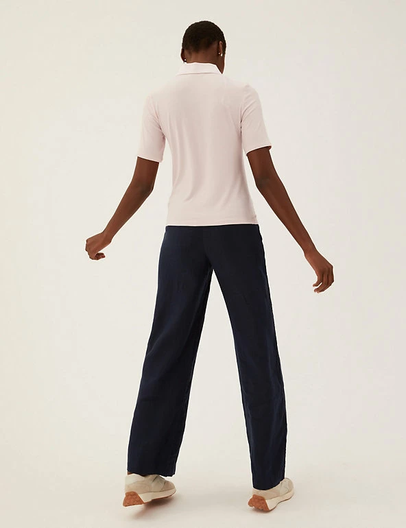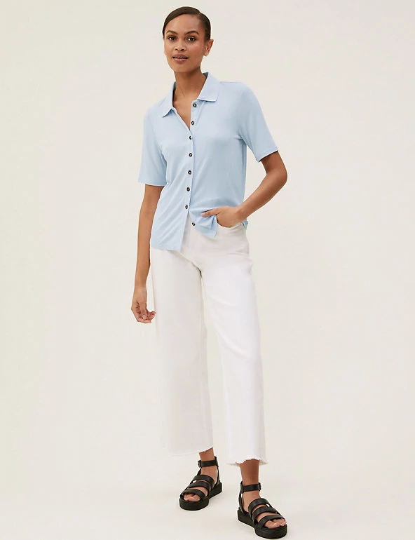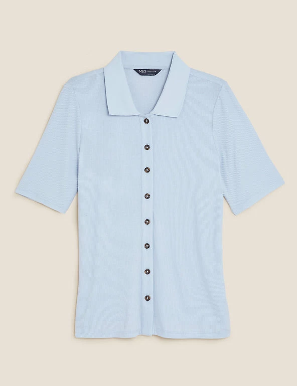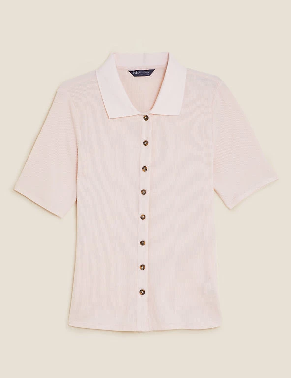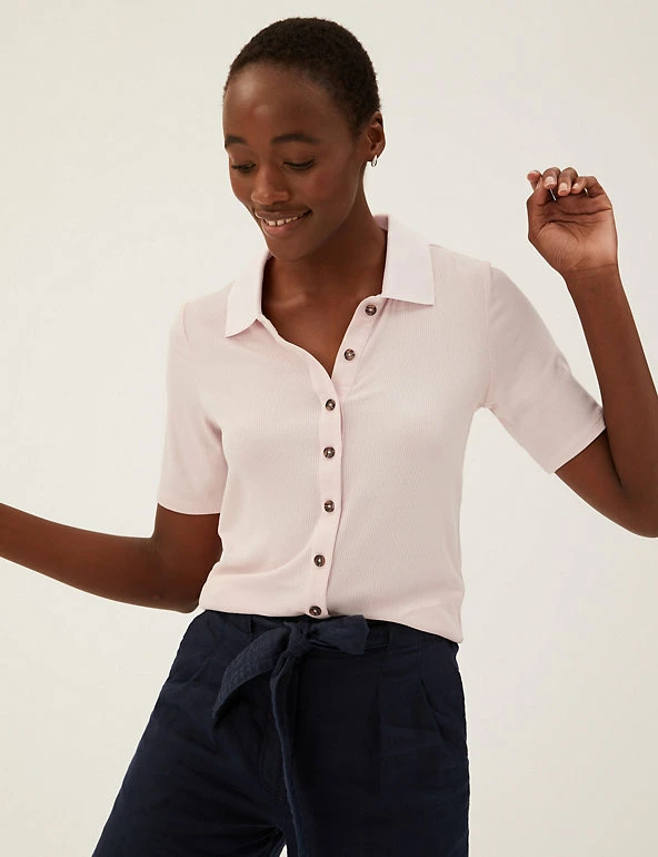 This versatile ribbed top will slot seamlessly into your everyday wardrobe. It’s designed in a regular fit with a smart collared neck and short sleeves. Button-through fastening for ease and added stretch for comfort.