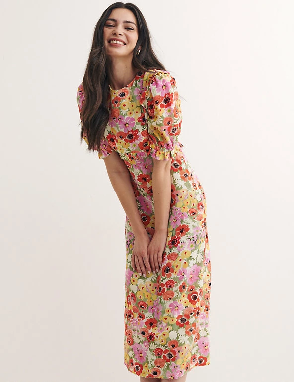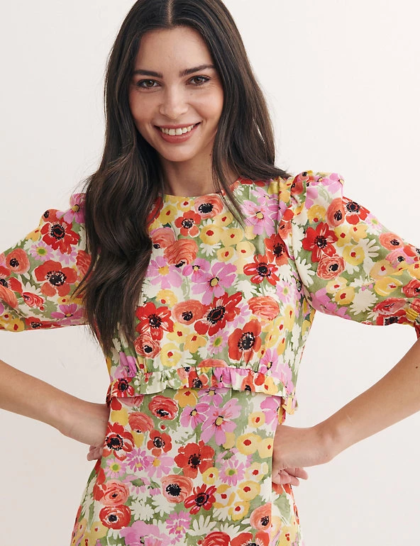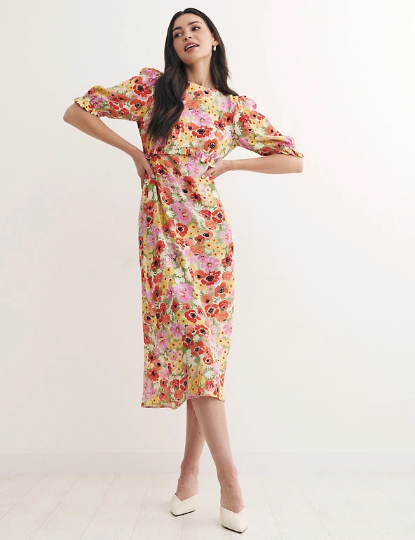 Bring a burst of summery colour to your look with this ditsy floral tea dress by Nobody’s Child. Designed in a regular fit, this playful piece falls to an elegant midi length and has breezy short sleeves. Pretty frill detail along the waist brings an on-trend spin. Made with sustainably sourced viscose.